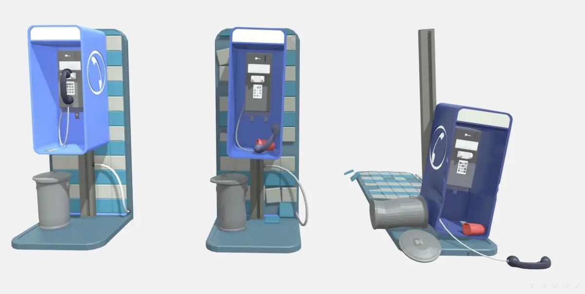 Description of a 3D model of a telephone booth in three different versions, each with varying levels of damage: