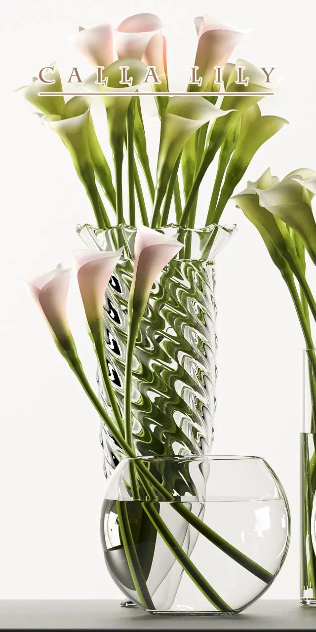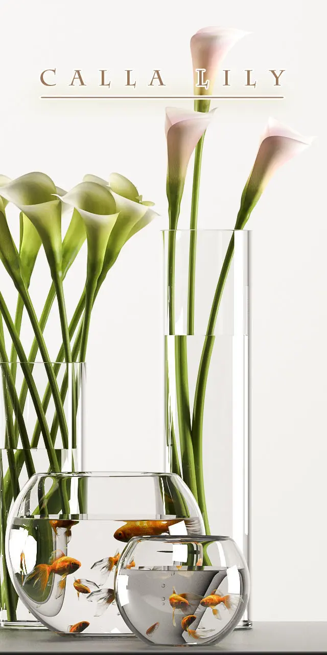 set of calla lilly flowers in a elegant glass vases in different shapes and sizes as required for your interior with more natural aquarium with gold fishes, hope it make a best choice for your interior.. designed completely in 3dsmax no plug ins are used