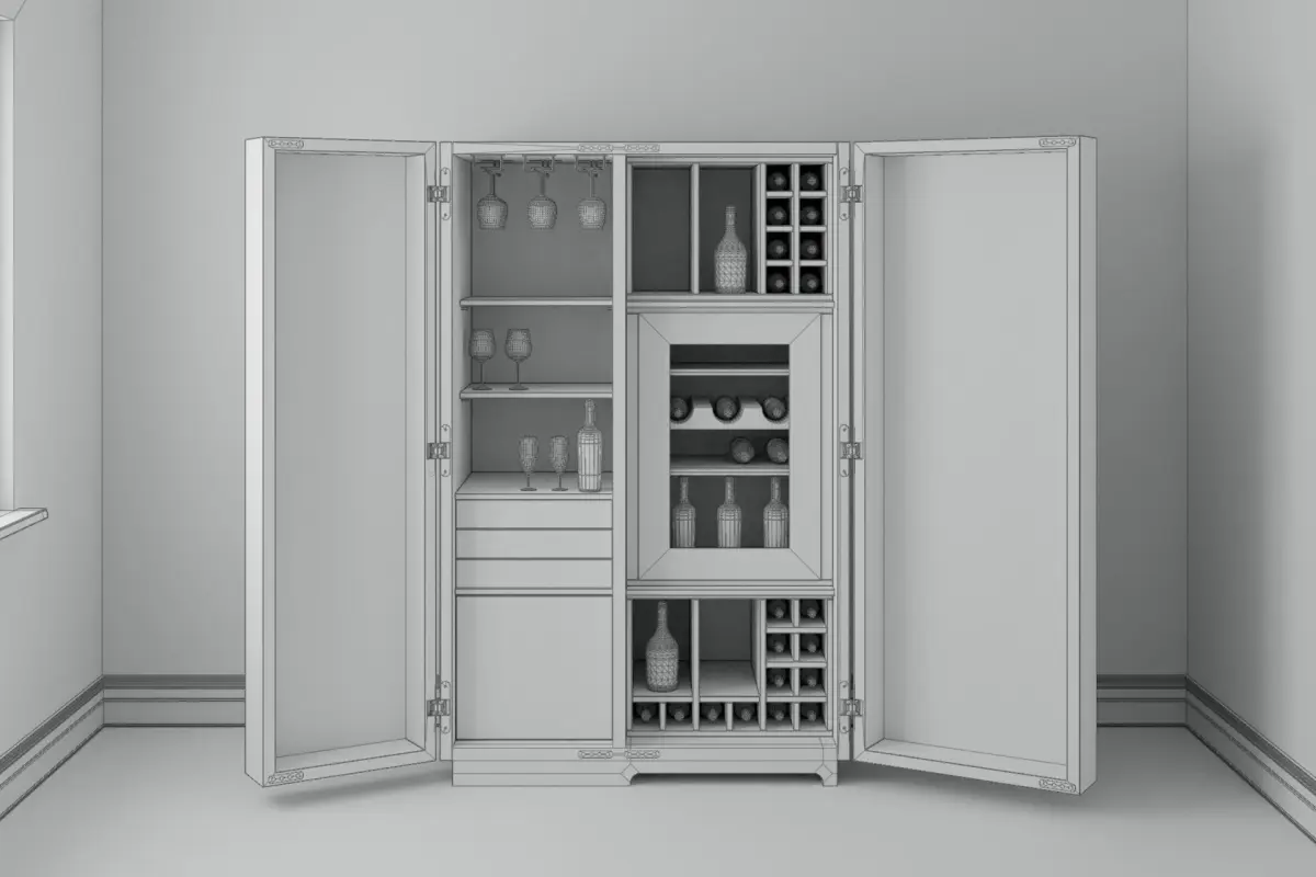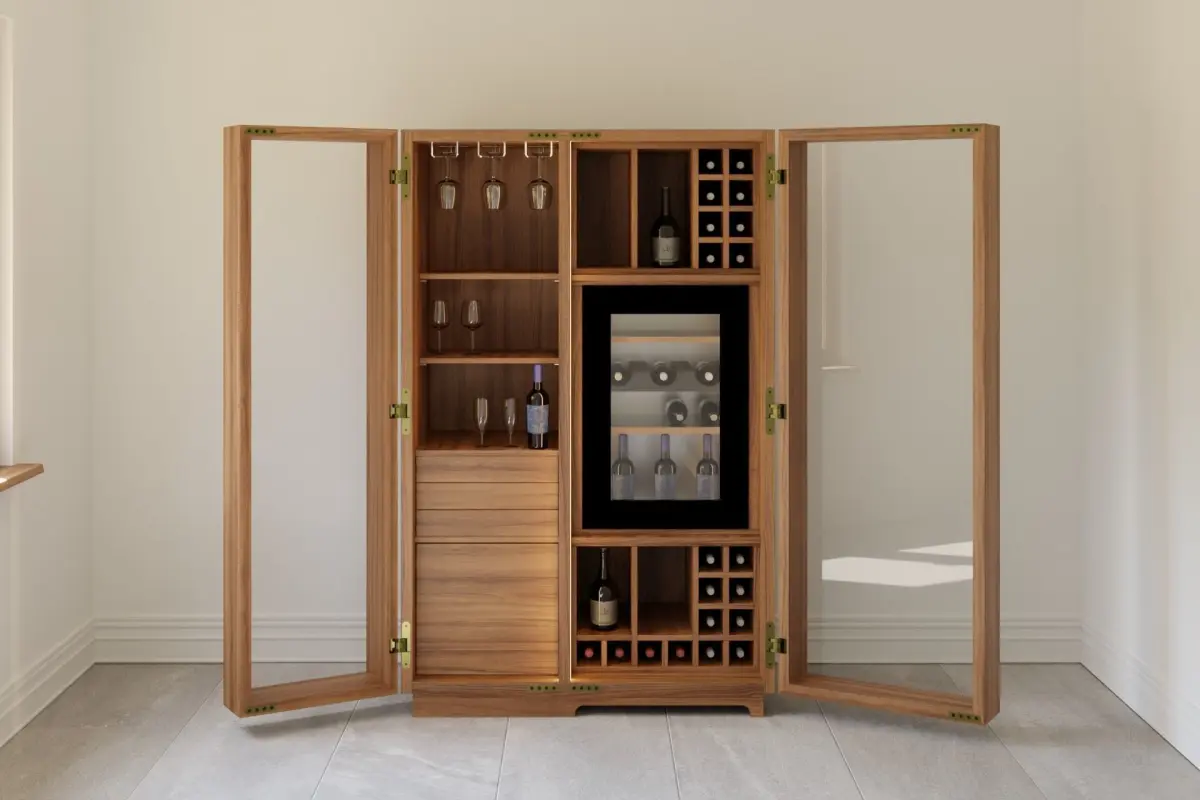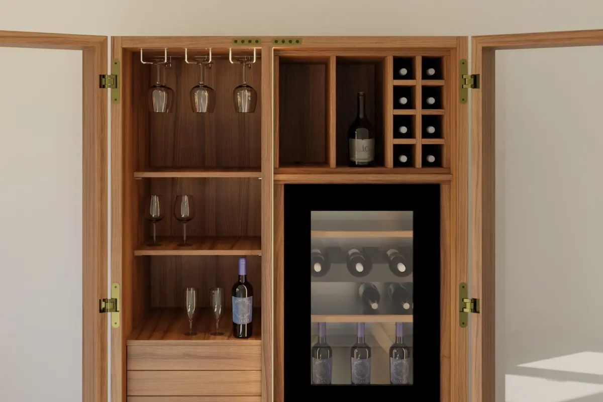 DESCRIPTION:Multifunctional storage unit in blockboard and solid wood, with double glass doors opening to 180°. Designed as a wine-storage unit, inside there are grids and containers for bottles and glasses, with an integrated wine cellar (maximum size for built-in appliances W.56 D.55 H.91.5 cm). The inside is illuminated by LED strips along the inner side, activated automatically via sensors when the doors are opened.