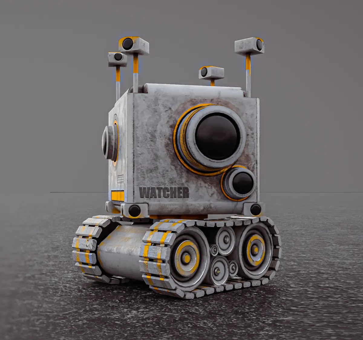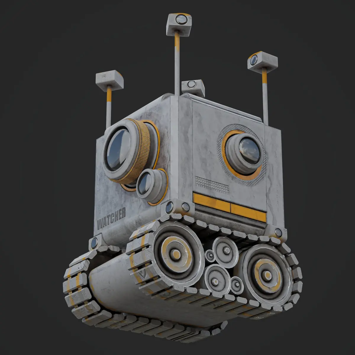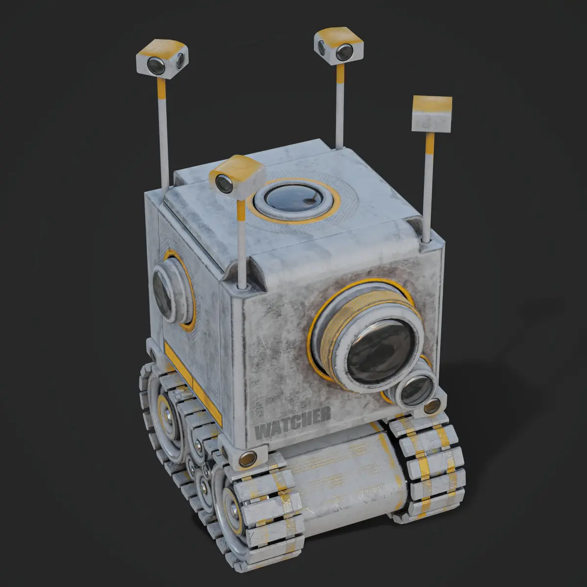 Hi...this is a Wall E type robot created and rigged as well animated in blender. The robot name is the watcher and it has 13 cameras for that purpose. the model is designed as if it has a back story. the model is low poly game ready asset ....with a proper rig and constraints to help with the movement . All the components are rigged and animated like all the cameras and treads and ofcourse the body. the uv mapping is proper well layout . the TD is good .info: