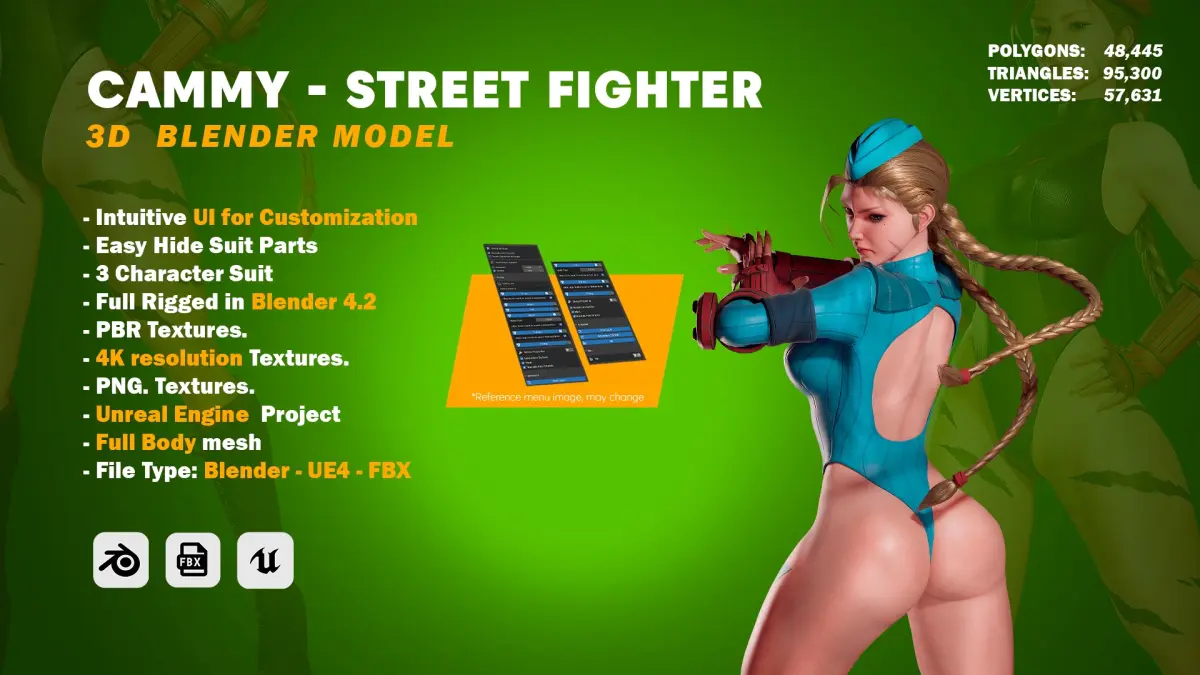 - Fully Rigged Blender Files: Includes versions of Cammy with various outfits such as Base Suit, Hot Suit, Naked, and Zero Suit.