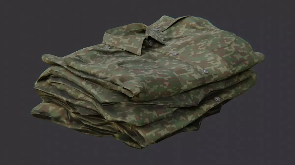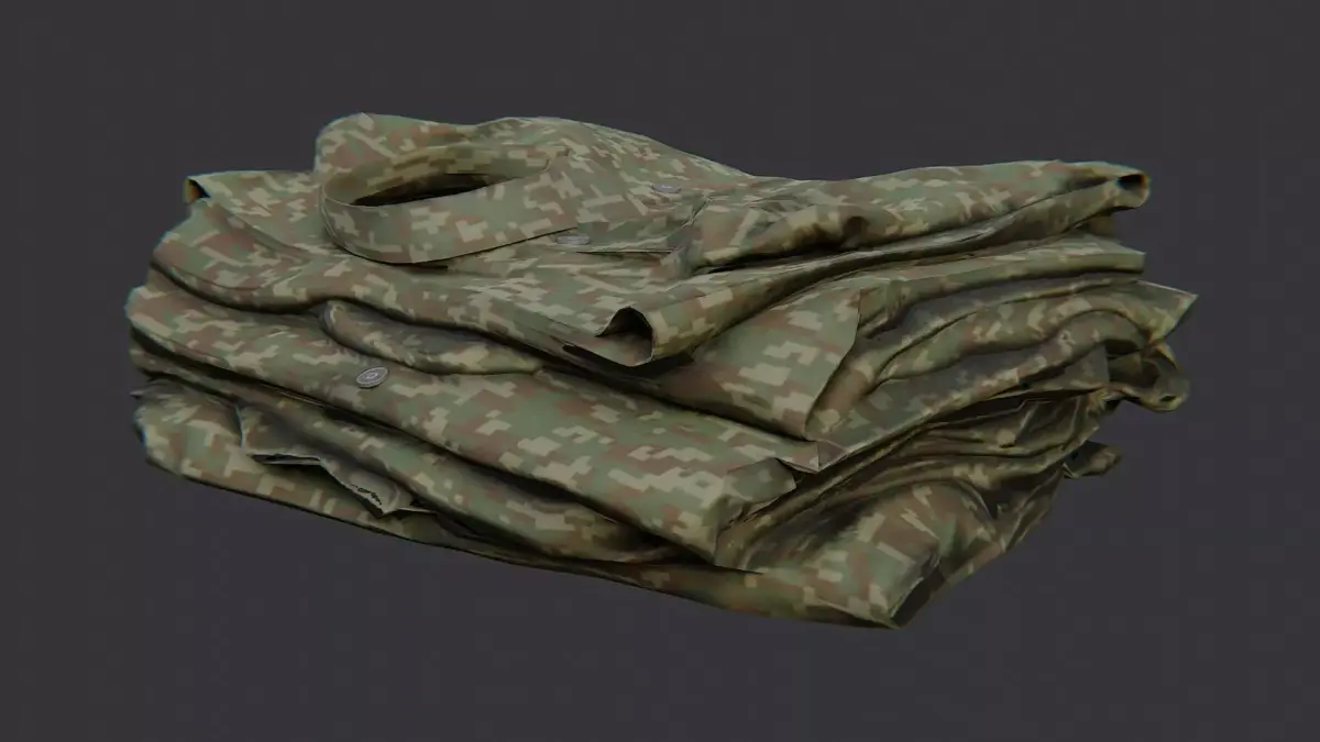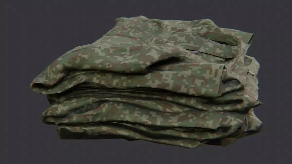 High-resolution fabric texture featuring camouflage pattern suitable for military-inspired characters and props. This folded fabric stack is optimized for close-up renders and cinematic scenes, providing realistic folds and shading. Ideal for character clothing, costumes, or tactical gear in renders and visualizations.