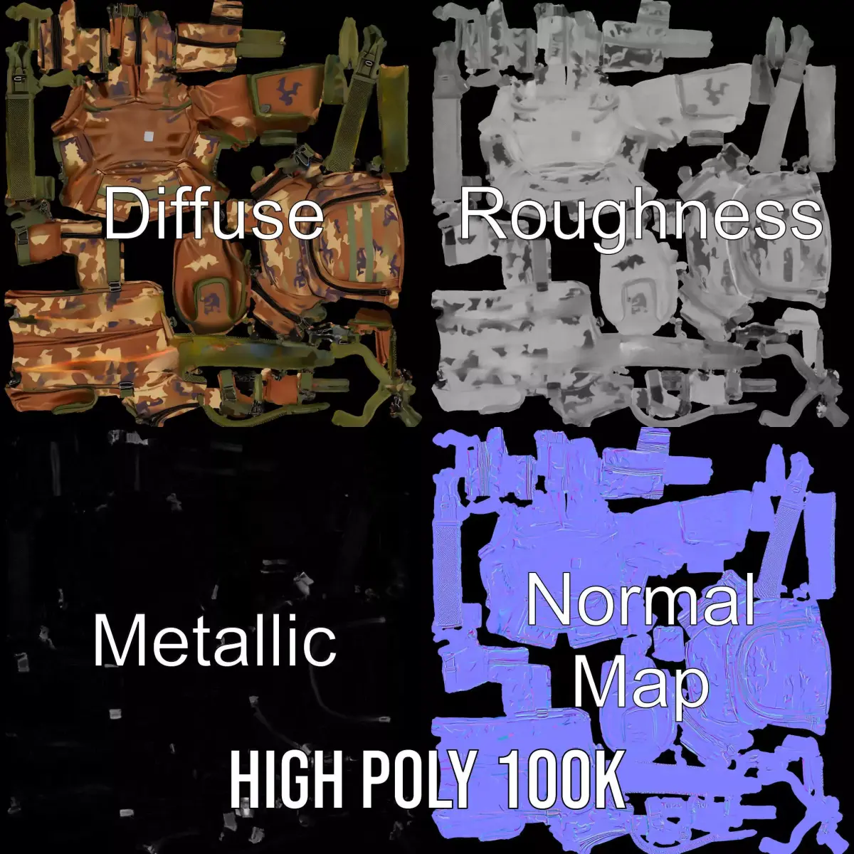 This camouflage tactical backpack model is perfect for those seeking a realistic and detailed 3D asset for games or visualization projects. Designed with military-style precision, it features multiple pockets and strong stitching, ideal for adventure scenes or military simulations. Each model has 3 levels of detail: low-poly (1000 triangles for mobile), middle-poly (10 000 triangles for environment), and high-poly (100 000 triangles), which allows for the use of this model in production rendering (such as 3ds Max, Maya, Cinema4D, Blender, Vray/Corona/Cycles and all others), game engines (Unity and Unreal compatible), and interactive presentations, providing a choice of detail based on the LOD System principle. The model's textures are PBR, Diffuse, NormalMap, and reflection/roughness/metallic, which are suitable for any modern rendering engine. All models are accurately unwrapped with no overlapping UV. All textures are 4096*4096 in size. Perfect for outdoor adventure showcases, military training simulations, and survival game settings. Please like and leave a comment if you enjoyed the model!