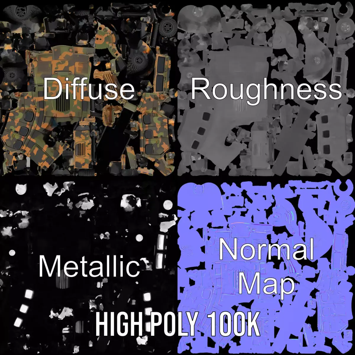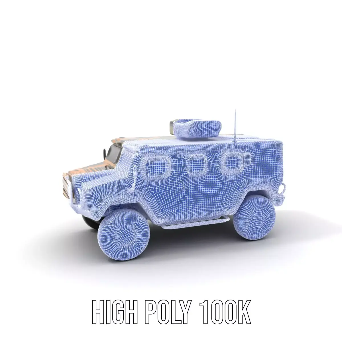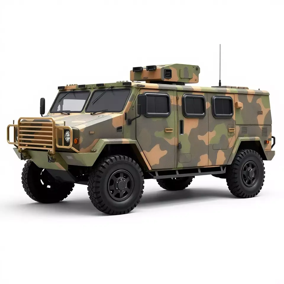 This highly detailed camouflage tactical vehicle model is perfect for military simulation, vehicle showcases, or strategy games. Each model has 3 levels of detail: low-poly (1000 triangles for mobile), middle-poly (10,000 triangles for environment), and high-poly (100,000 triangles), which allows for the use of this model in production rendering (such as 3ds Max, Maya, Cinema4D, Blender, Vray/Corona/Cycles and all others), game engines (Unity and Unreal compatible), and interactive presentations, providing a choice of detail based on the LOD System principle. The model's textures are PBR, Diffuse, NormalMap, and reflection/roughness/metallic, which are suitable for any modern rendering engine. All models accurately unwrapped and have no overlapping UV. All textures are 4096*4096 in size. If you like this model, please leave a comment and a like.