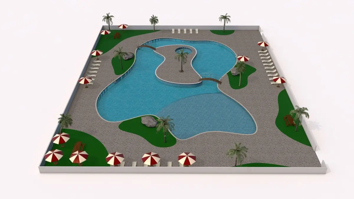 camp swimming pool is a large swimming pool suitable for campsites, hotels or amusement parks. It is equipped with a large pool, a jacuzzi, bridges, tables, armchairs and parasolsAll parts are clearly named and isolated. So you can réarrange the decor.
