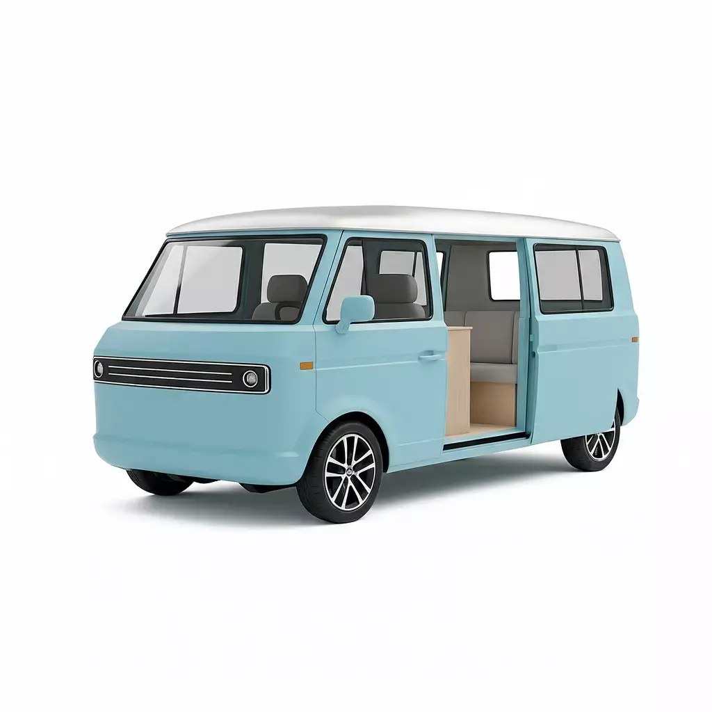 This is a charming and stylized 3D model render of a compact microbus or camper van that blends retro aesthetics with modern design simplicity. The vehicle is painted a cheerful pastel light blue and features a contrasting silver-white roof. Its boxy, rounded shape is highly reminiscent of classic vintage vans. The model is detailed with an open sliding side door, revealing a simplified but functional interior setup, including a bench seat/bed area and a light wood cabinet, suggesting a cozy camper or recreational vehicle configuration. Its clean lines and stylized look make this 3D asset ideal for use in mobile games, animated projects, architectural visualizations, or low-poly scenes that require a friendly, contemporary take on a classic vehicle.