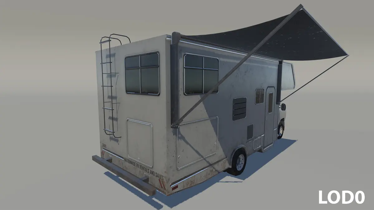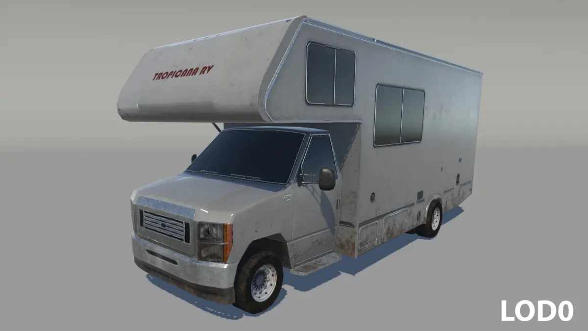 The RV (also known as Campervan or Motorhome) includes 2 levels of detail (LOD), with a dedicated texture set for the wheels.