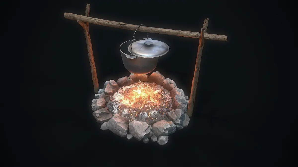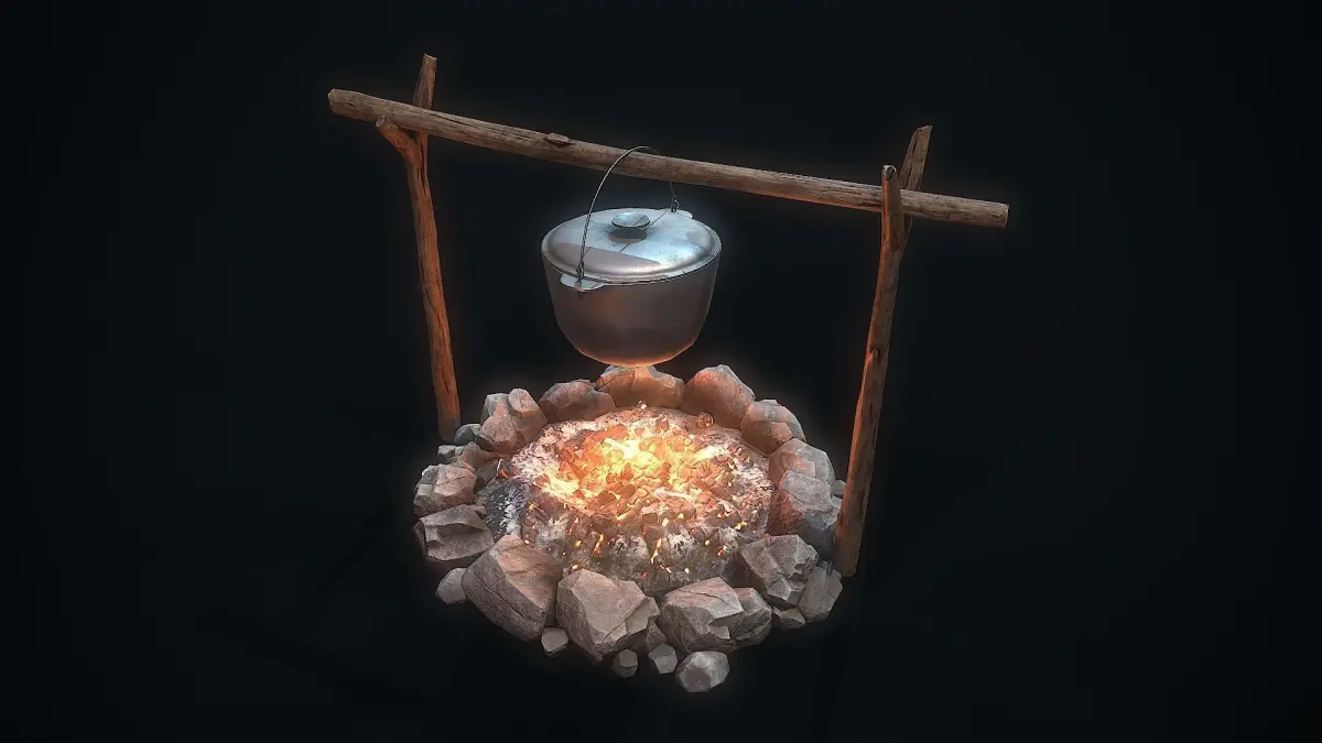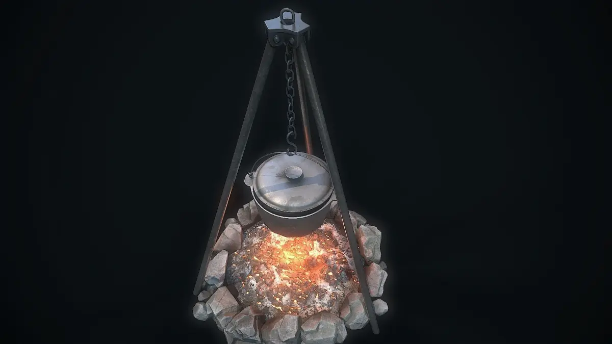 Camping bonfire bowler tripod. This model is suitable for use in game, film, advertising, design visualization, etc.