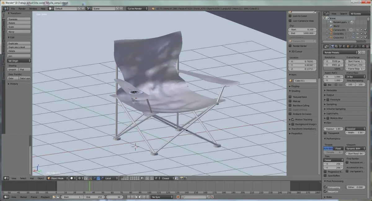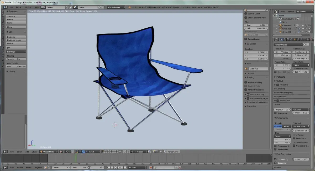 Una Silla de Camping, hecha en blender seteada para ser rendereada con cycles en alta resolución.