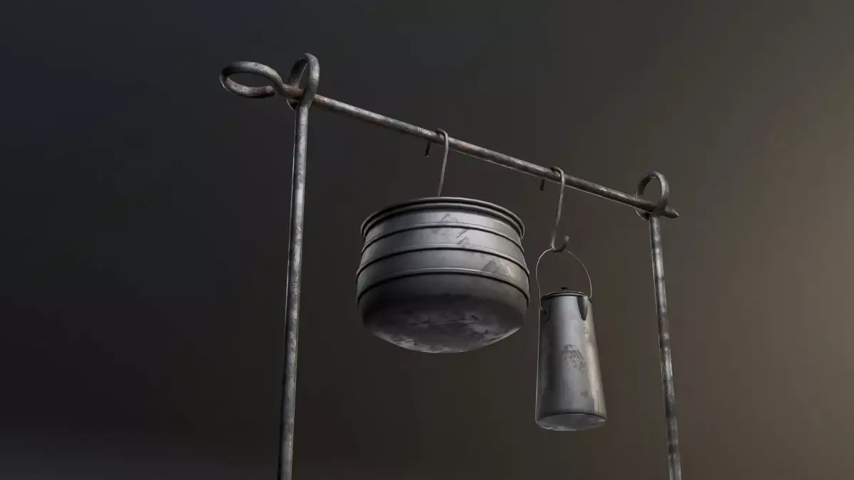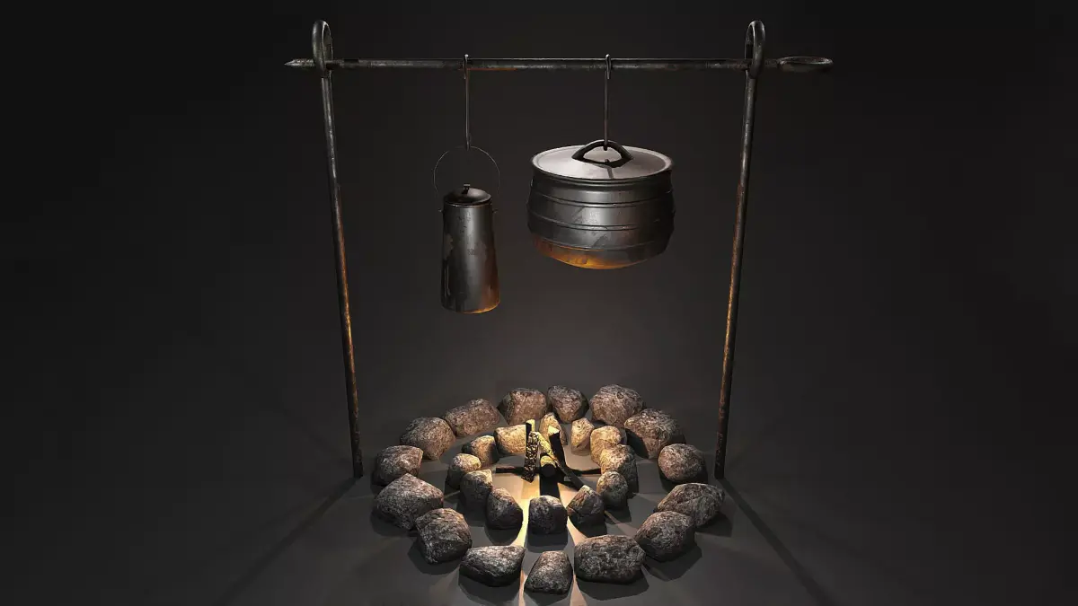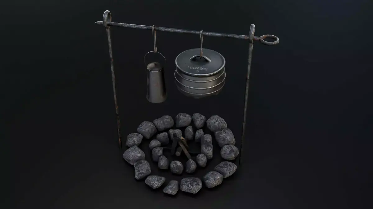 3D model of a camping fire pit setup with a stone circle, sticks, kettle, and pot. The model has realistic textures, weathered metal, and natural rock details. Built with clean, optimized topology and a low poly count, it’s for games or survival-themed renders. Perfect for creating realistic campsite environments in both stylized and semi-realistic projects. Including: