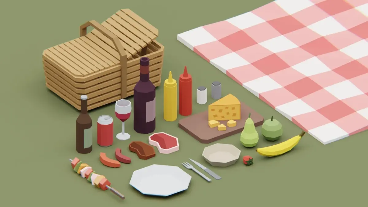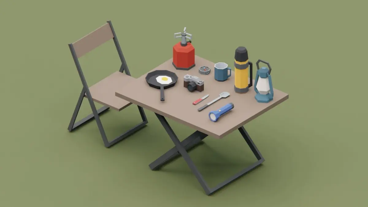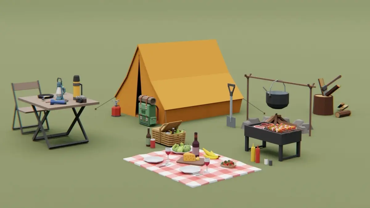 - Include: tent, backpack, picnic accessories and food, basket, campfire, shovel, axe, firewood, travel accessories, compass, thermos, gas burner, frying pan, knife, camera, table and chair, bbq grill and other .