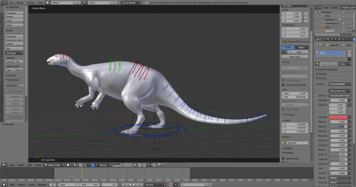 OverviewThis a dinosaur Camptosaurus from Jurassic period. The model is rigged, posed and ready for render. The mesh is fully made of quads, Uv unwrapped without overlapping UVs. The rig is handmade with IK system and custom shapes for important bones. Material was build with principled bsdf shader for Cycles render engine.The file is available in .blend .fbx with rig and .obj as well.