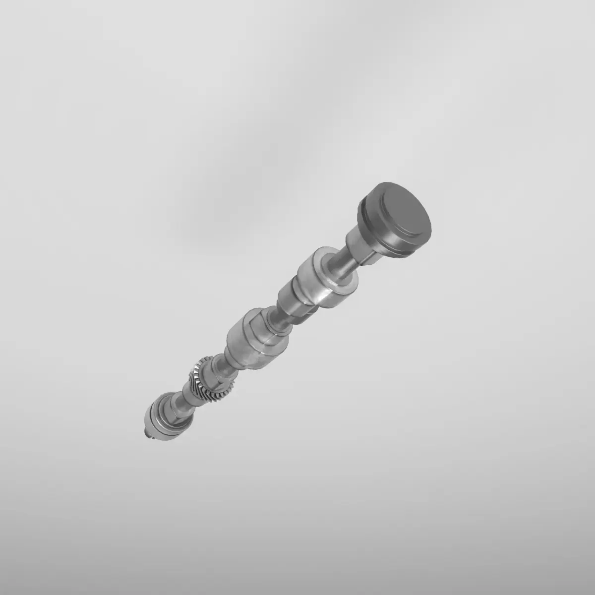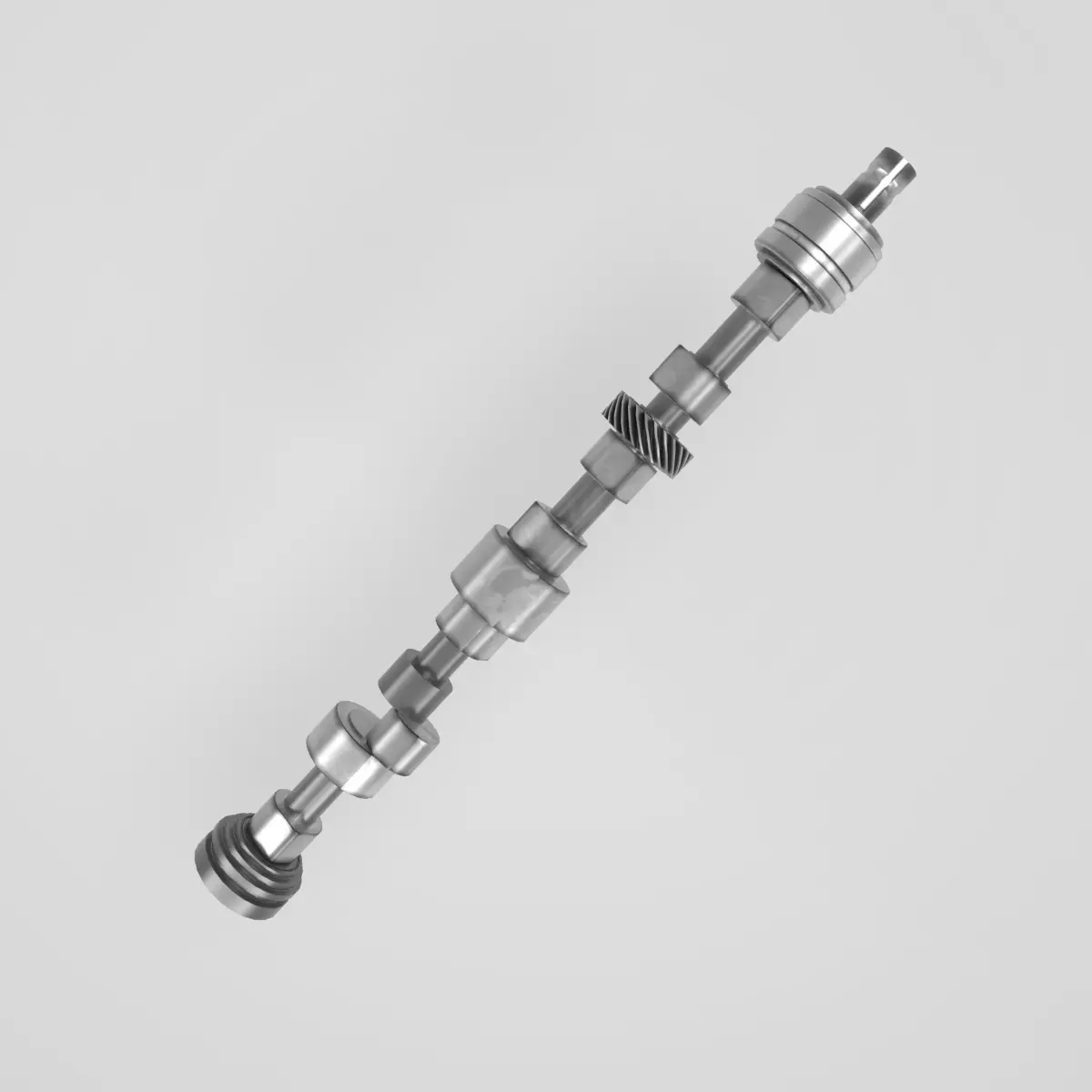 A precisely detailed 3D model of an Engine Camshaft, featuring accurately shaped cam lobes, bearing journals, and a helical gear. This component is essential in controlling the timing and lift of the engine valves, ensuring synchronized intake and exhaust operations.