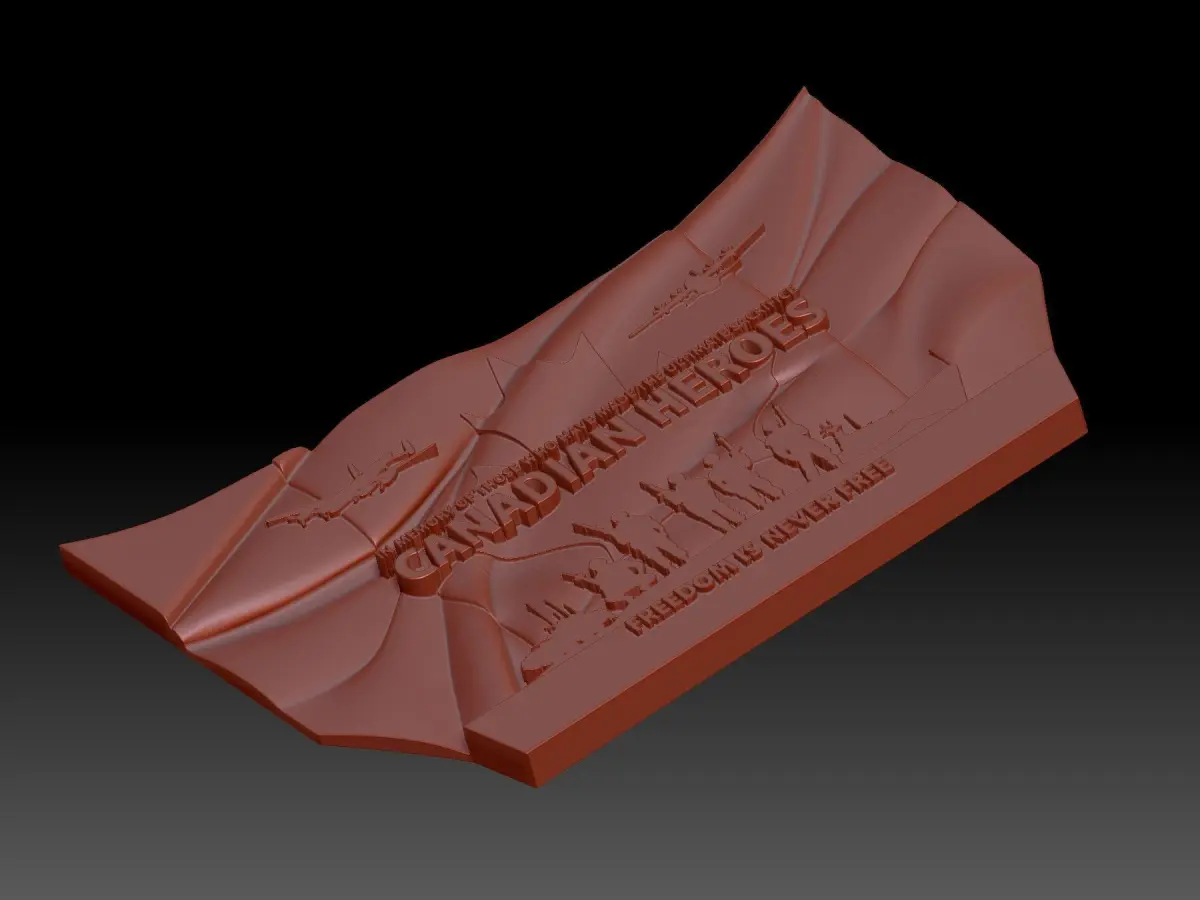 A 3D model of the bas-relief called Canadian heroes depicts silhouettes of soldiers, military equipment and airplanes. In the background, you can see the flag of Canada. This project is ideal for 3D printing and working with CNC machines.
