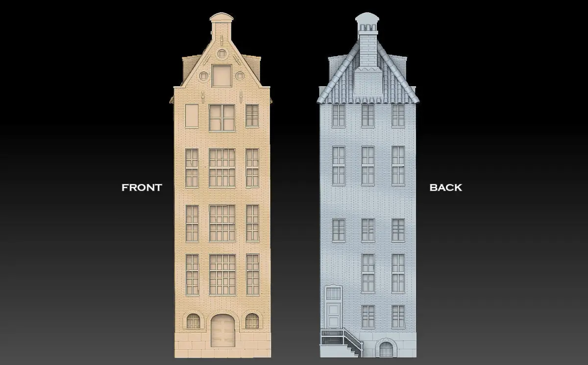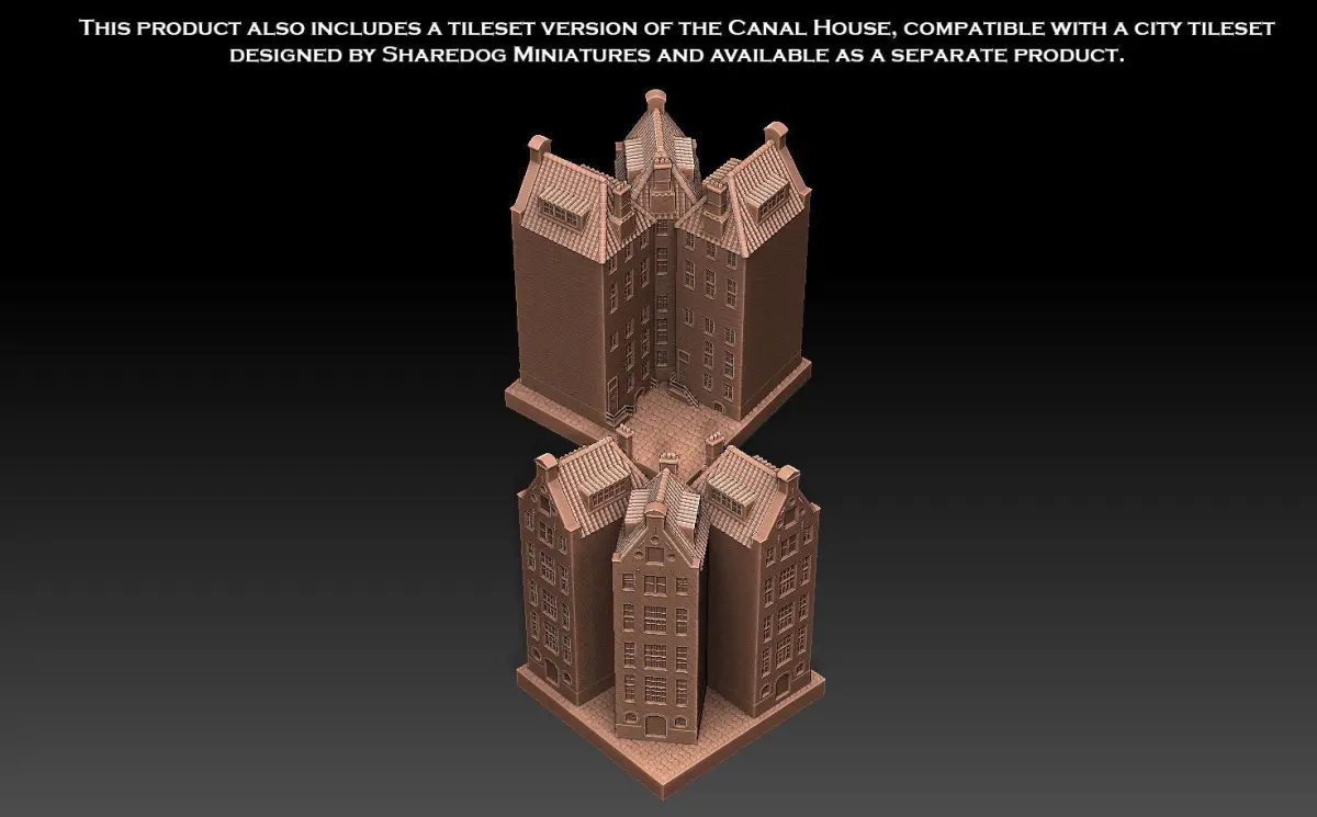 This product includes one Canal House, printable at 6mm to 28mm scale for tabletop games or as a larger decorative object. It also includes a tileset version of a block of Canal houses, which is compatible with an urban tileset designed by Sharedog Miniatures and available as a separate product.