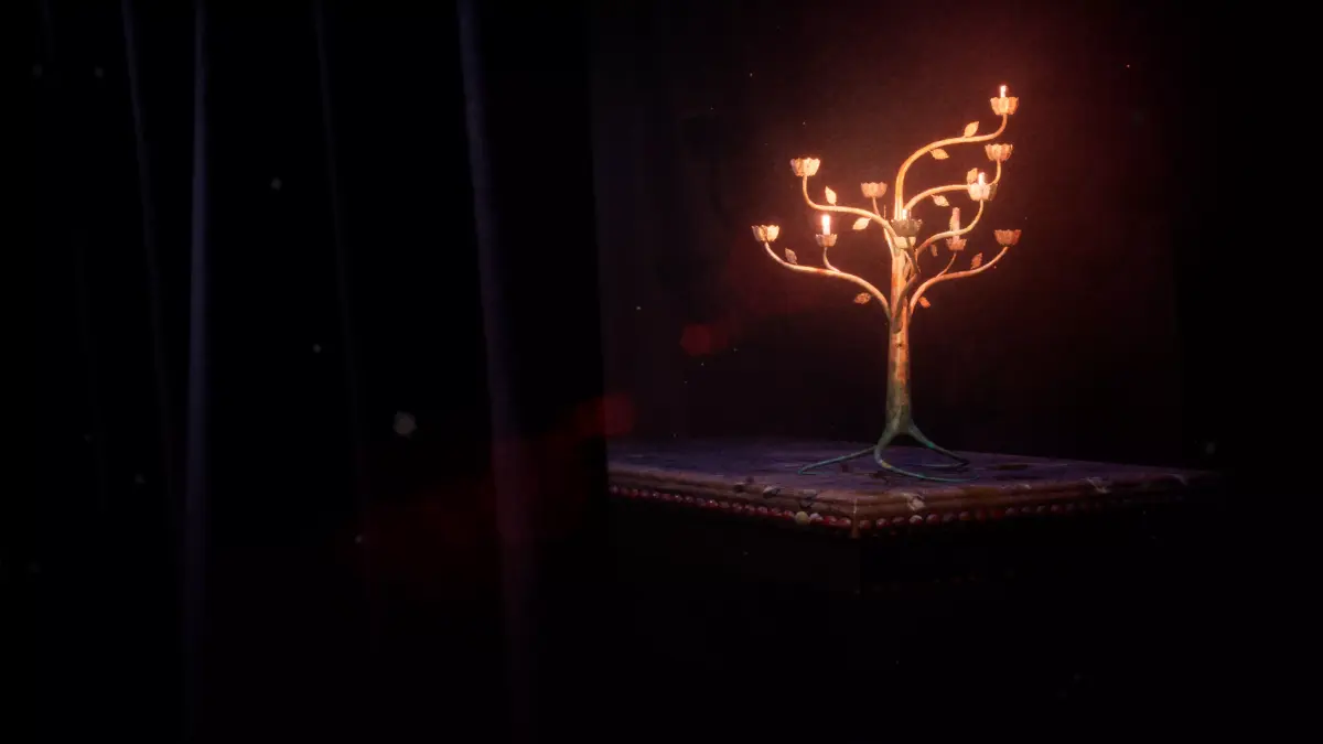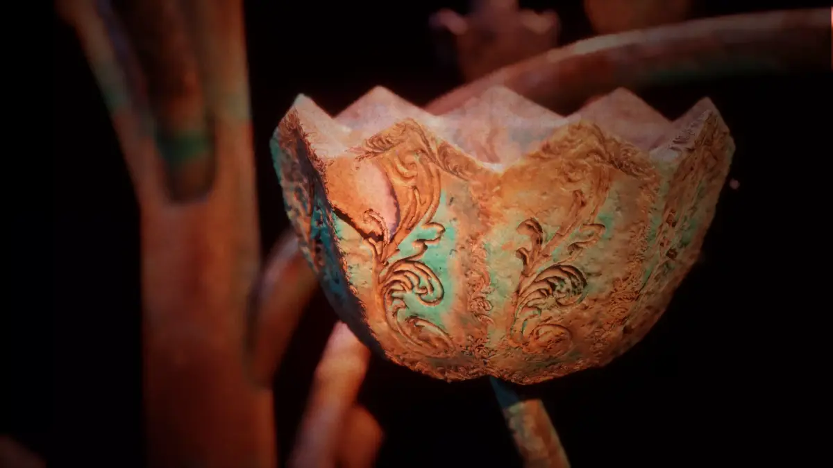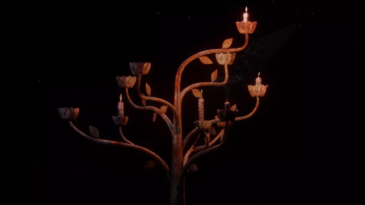 Modular object project for decoration, chandelier with organic shapes, with oxidized bronze material. Includes a simple table setting to place it and curtains around it.