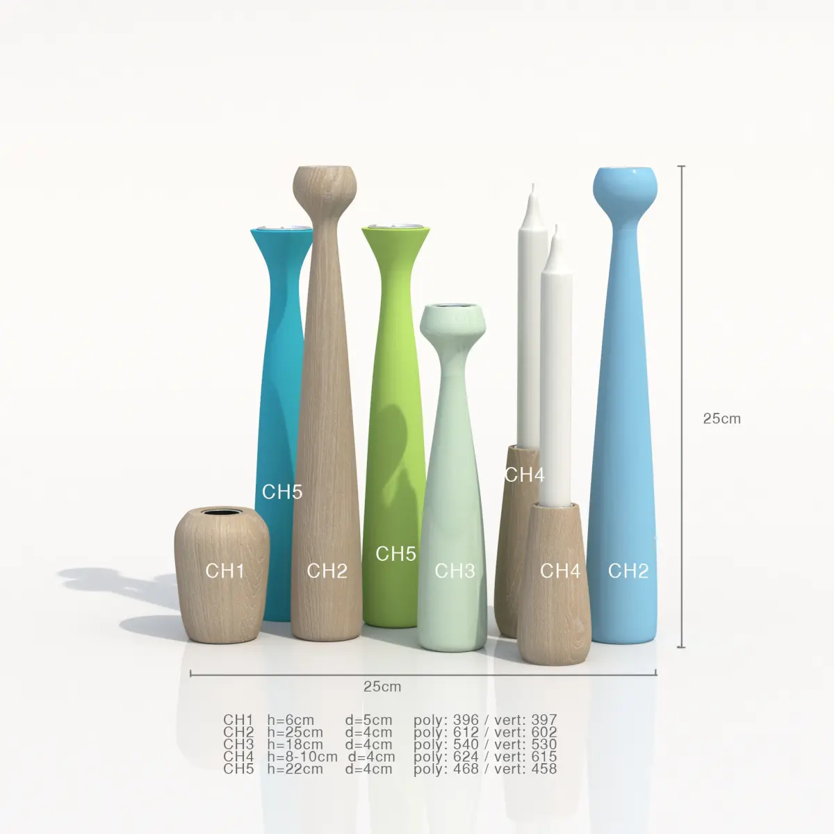 This is a 3d model of a set of candle holders.