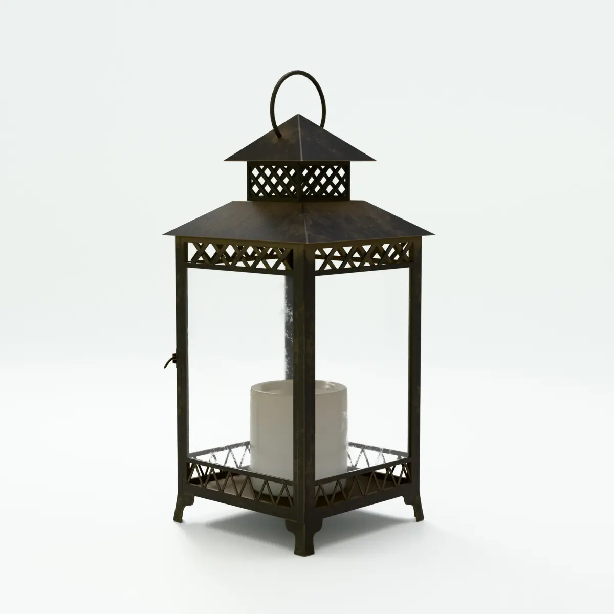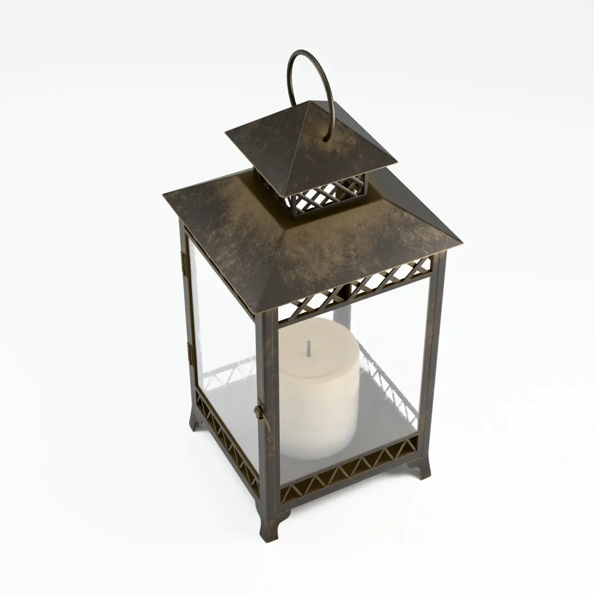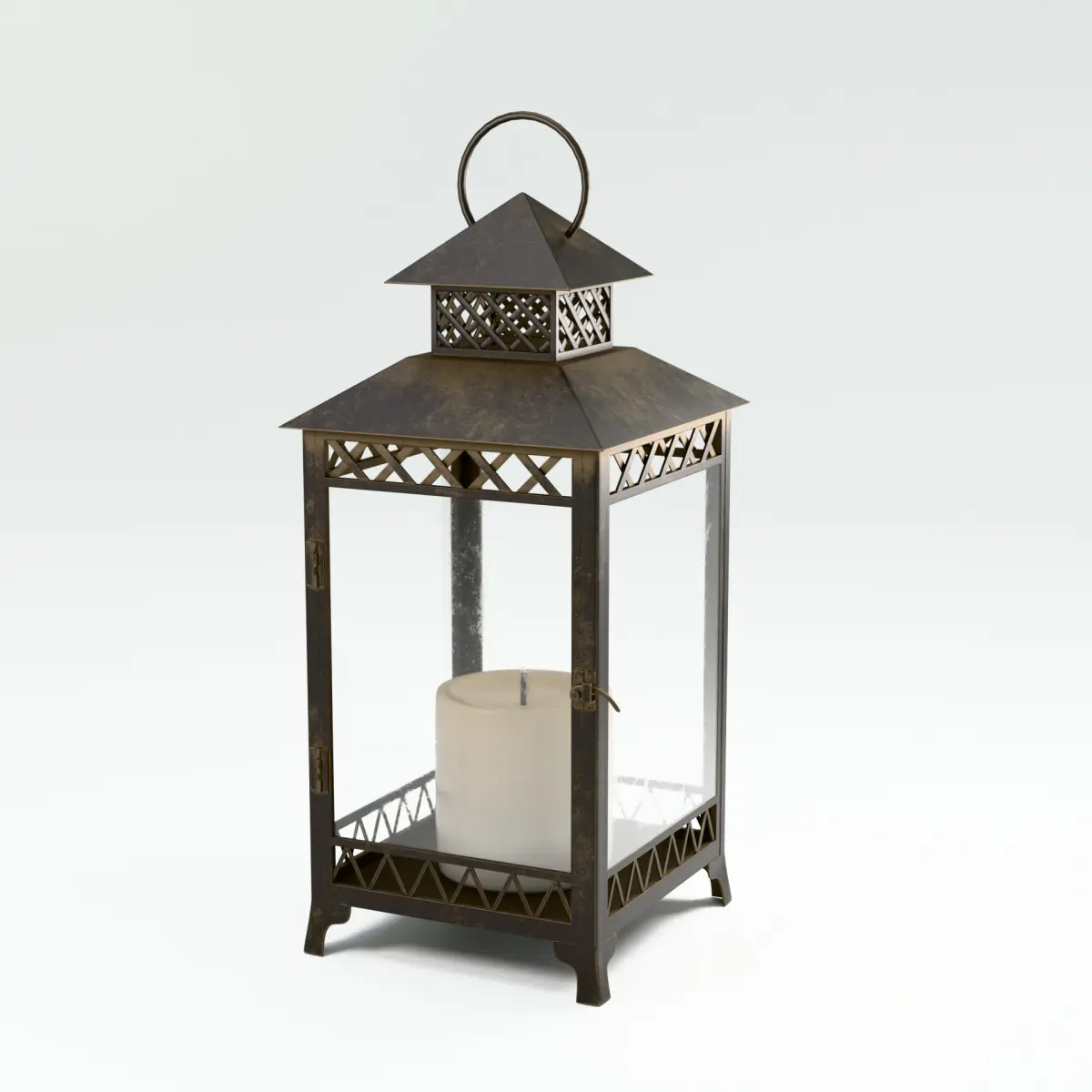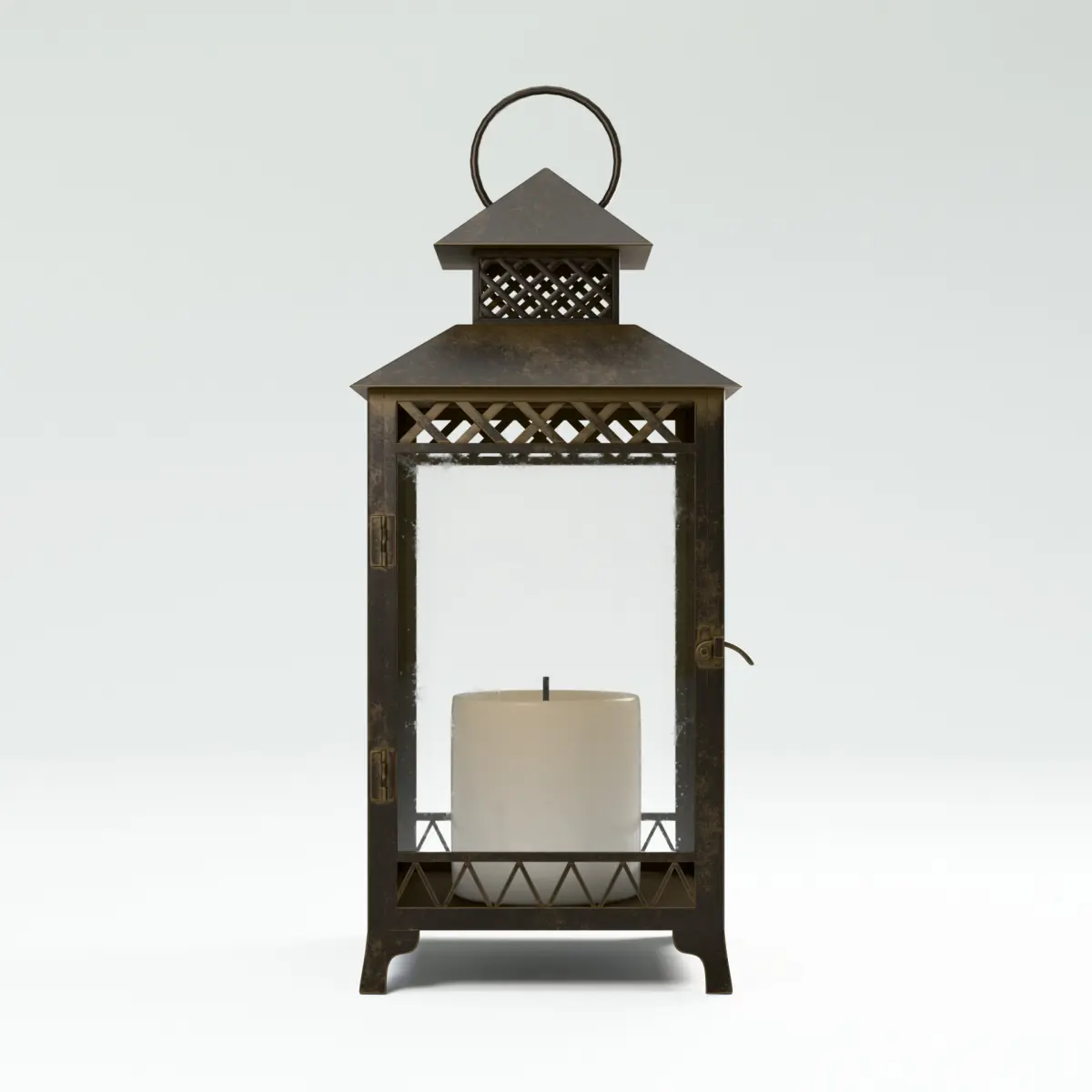 Candle Lantern: Add a touch of rustic charm to your space with this candle lantern. The lantern is made from metal and features a beautiful antique finish. It has a hinged door for easy access to the candle inside. The packaging features a label with a graphic of the lantern and suggests using it for outdoor gatherings or as a decorative accent. Size: 12 inches tall.