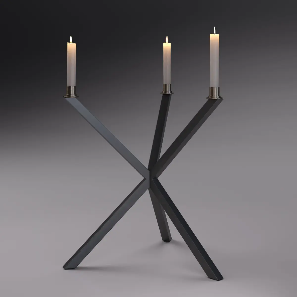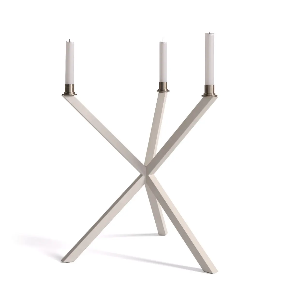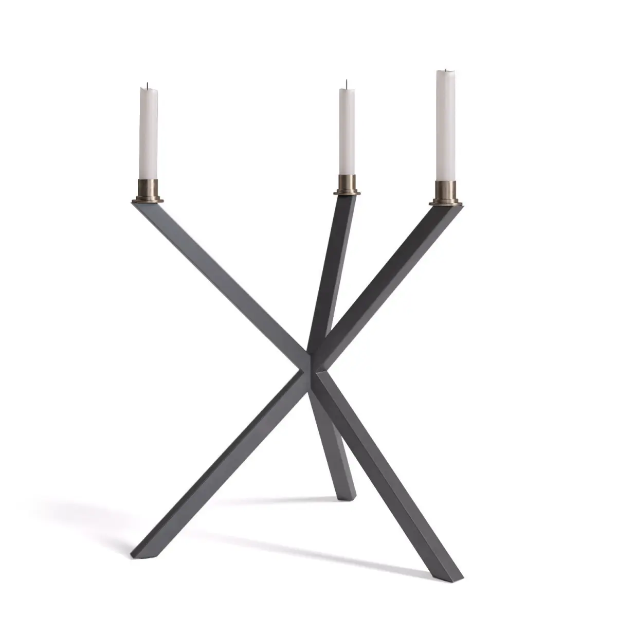 This elegant and sculptural tripod candelabra is a striking piece from the Swedish design studio No Early Birds, founded by architect and designer Per Söderberg. The design is part of a broader contemporary furniture collection that is known for its timeless appeal, rooted in the characteristic architectural cross-leg construction and an ingenious, minimalist mounting system. Every piece is crafted in Sweden with attention to sustainability and a holistic approach to form and function.
