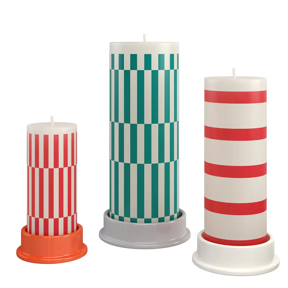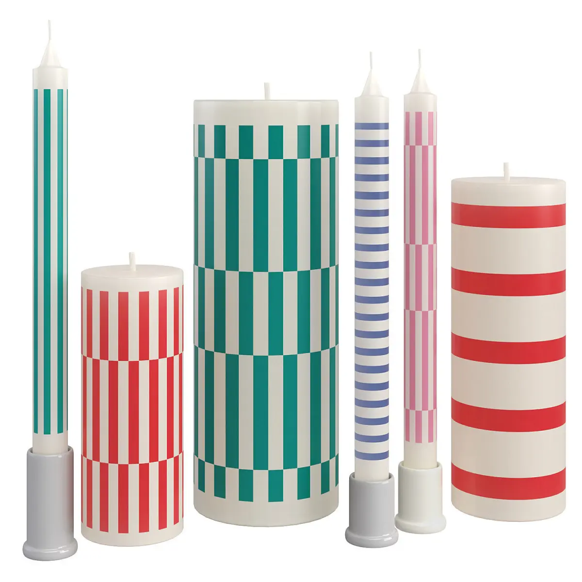 With their solid shape and colorful stripes all around in a variety of vertical and horizontal variations, Hay candles bring a playful and modern touch to your decor.