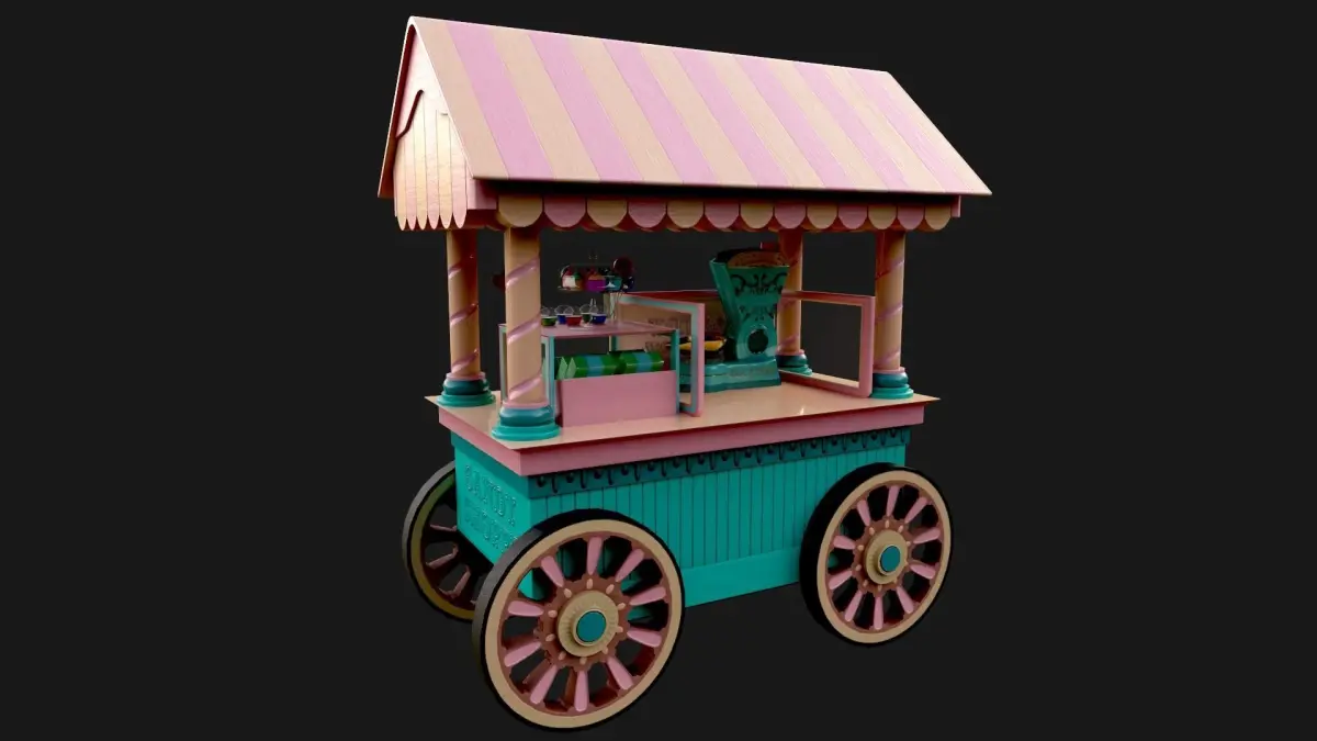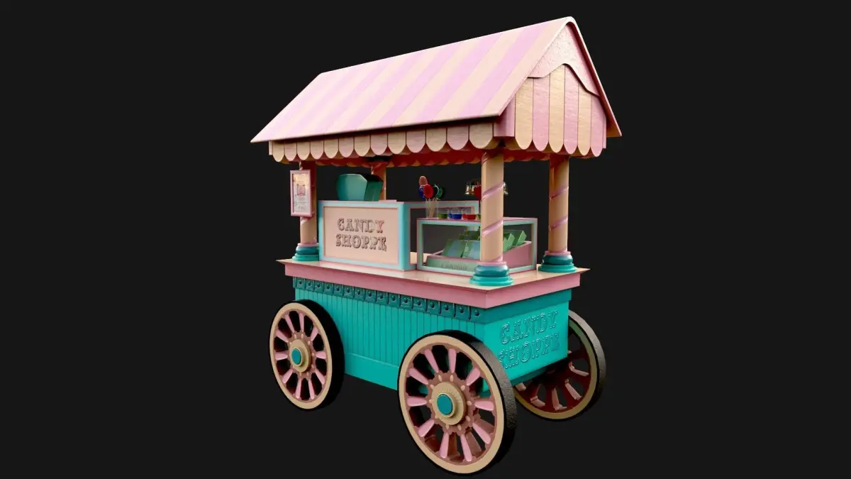 Low poly candy cart from fairs with sweets and chocolates. Made in Maya, baked in Marmoset, textured in Substance.