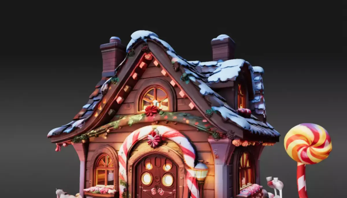This model features a house made of candy canes, lollipops, and a chocolate-style roof, created in a stylized cartoon design with vibrant colors and fun proportions. Perfect for fantasy towns, adventure games, and animated short films.
