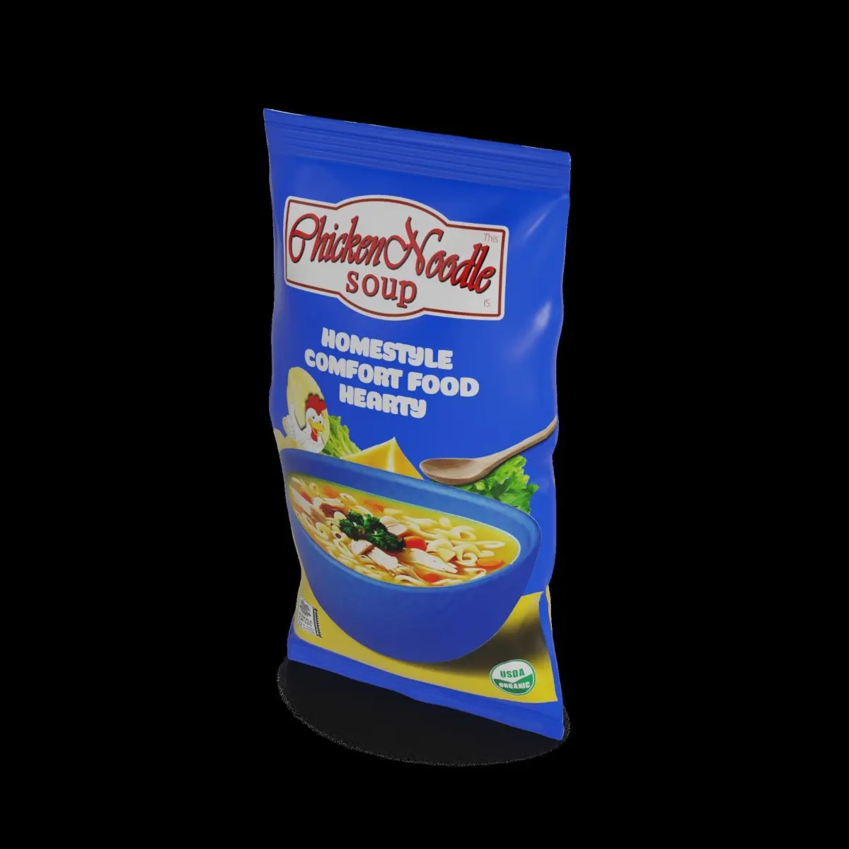 Packet Chicken Noodle Soup: This convenient packet of chicken noodle soup is a lifesaver when you're feeling under the weather. The packaging is a bright yellow color, with a clear window that showcases the hearty noodles and chunks of chicken inside. The label includes a graphic of a chicken and a bowl of soup, along with the words homestyle and comfort food. Just add hot water, and in minutes you'll have a steaming bowl of delicious soup.
