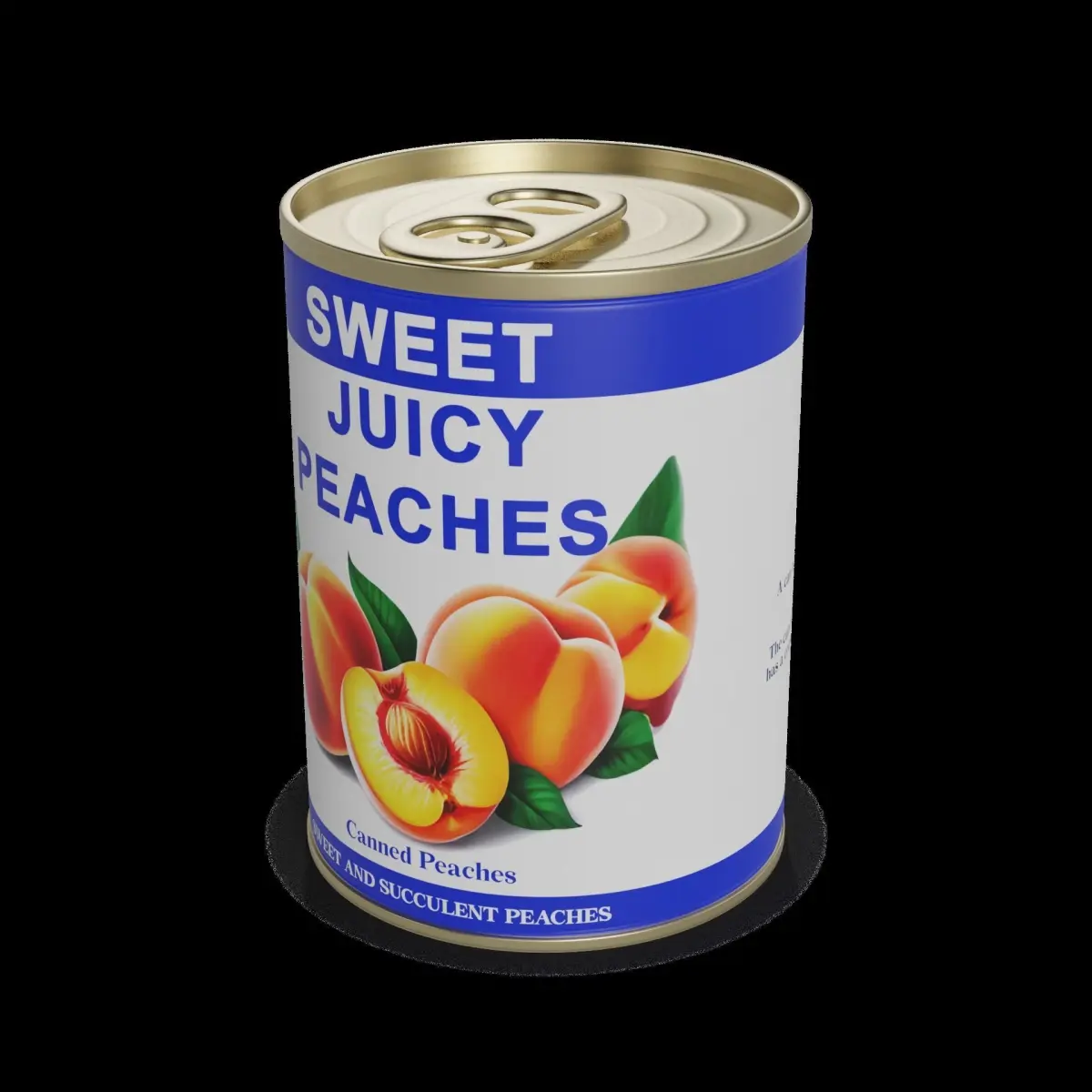 Canned Peaches: A can of juicy, golden peaches packed in light syrup. The can features a vibrant label with a picture of ripe peaches, and the text Sweet and Succulent Peaches in bold letters. The can is made of sturdy aluminum and has a convenient pull-tab for easy opening.