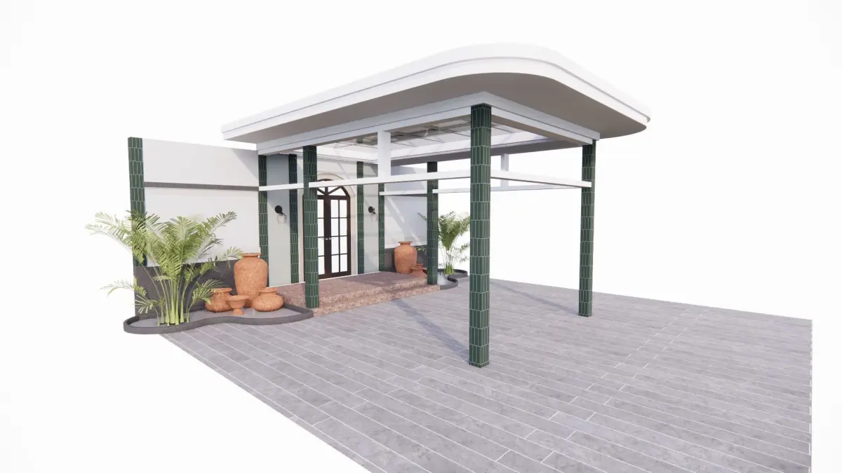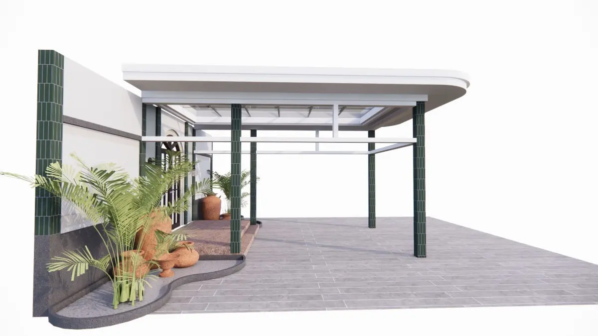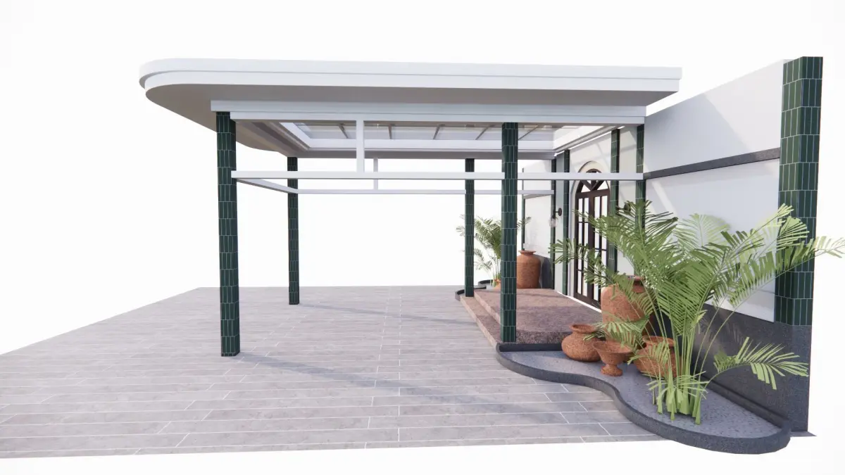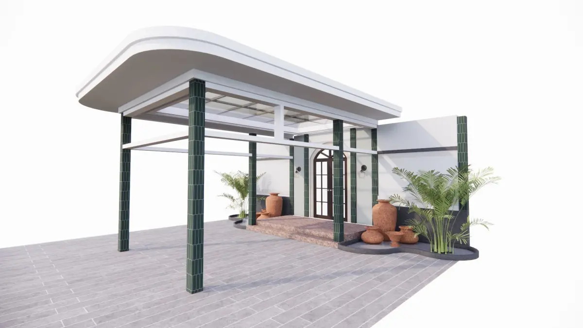 This building has a combination of concrete and glass canopies at the main entrance which is decorated with greenery that provides artistic value and there are columns as the structure so that it is comfortable for its residents, is the value of art in a building
