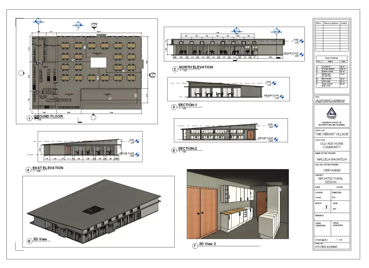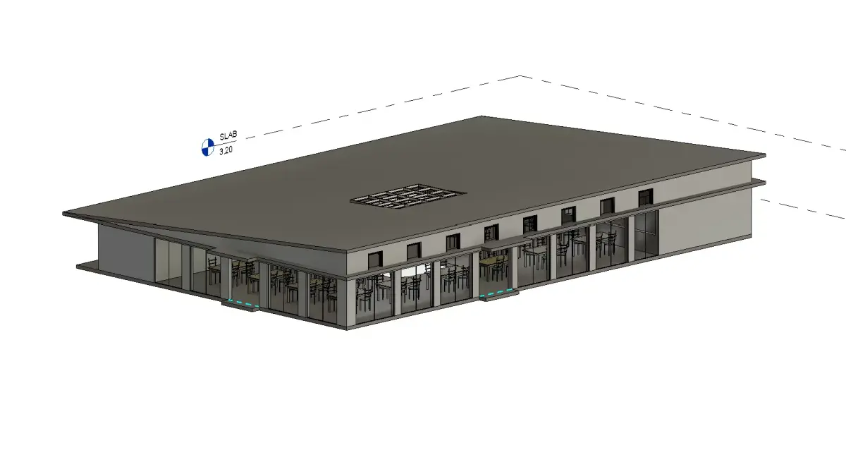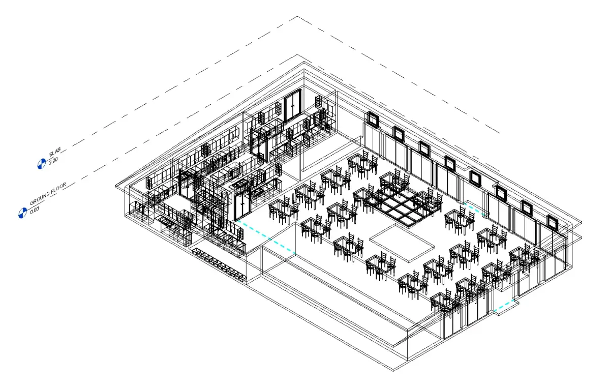A well-organized Autodesk Revit (.RVT) model of a canteen with kitchen facilities, designed for community centers, institutions, schools, offices, and public spaces. This model provides both architectural design and functional planning for food service areas.