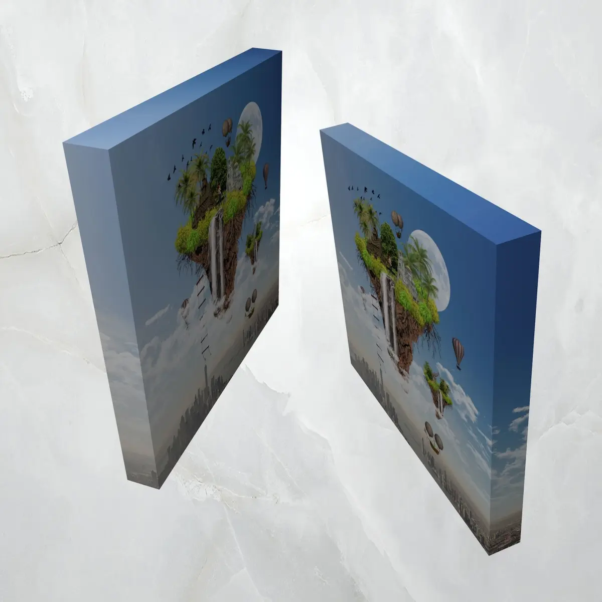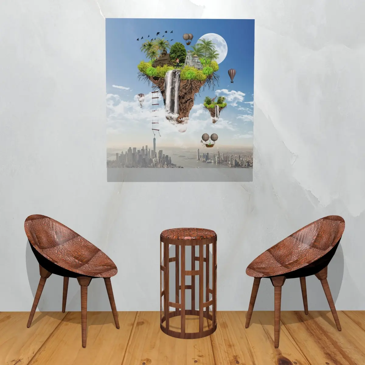 A canvas art featuring floating island, coconut trees, grasses, elephants, giraffe, waterfall, hanging bridge, house, and honeymooners above New York city and along birds and air balloons.A 3D model suitable for still images, presentation, renders, animation, videos, gaming, and other purposes (commercial and noncommercial).The texture image is baked and embedded into the polygons. It is also engraved on wood.The back of the canvas is with wood texture and extruded to enable wall attachment.Some scaling and rotation may be needed upon import depending on 3D software used.