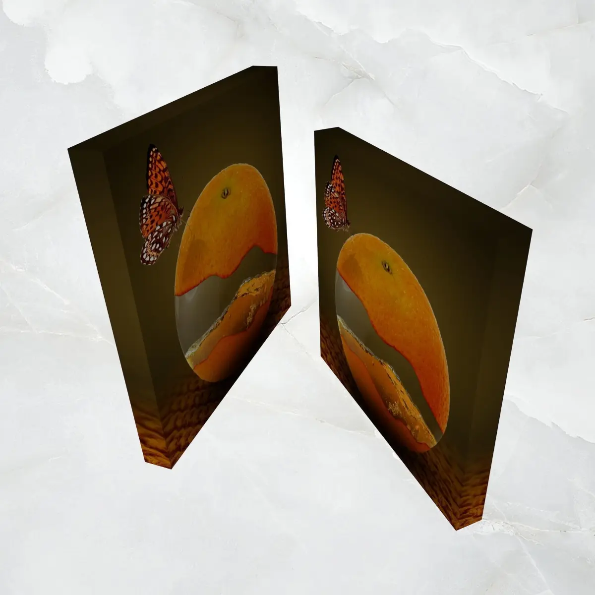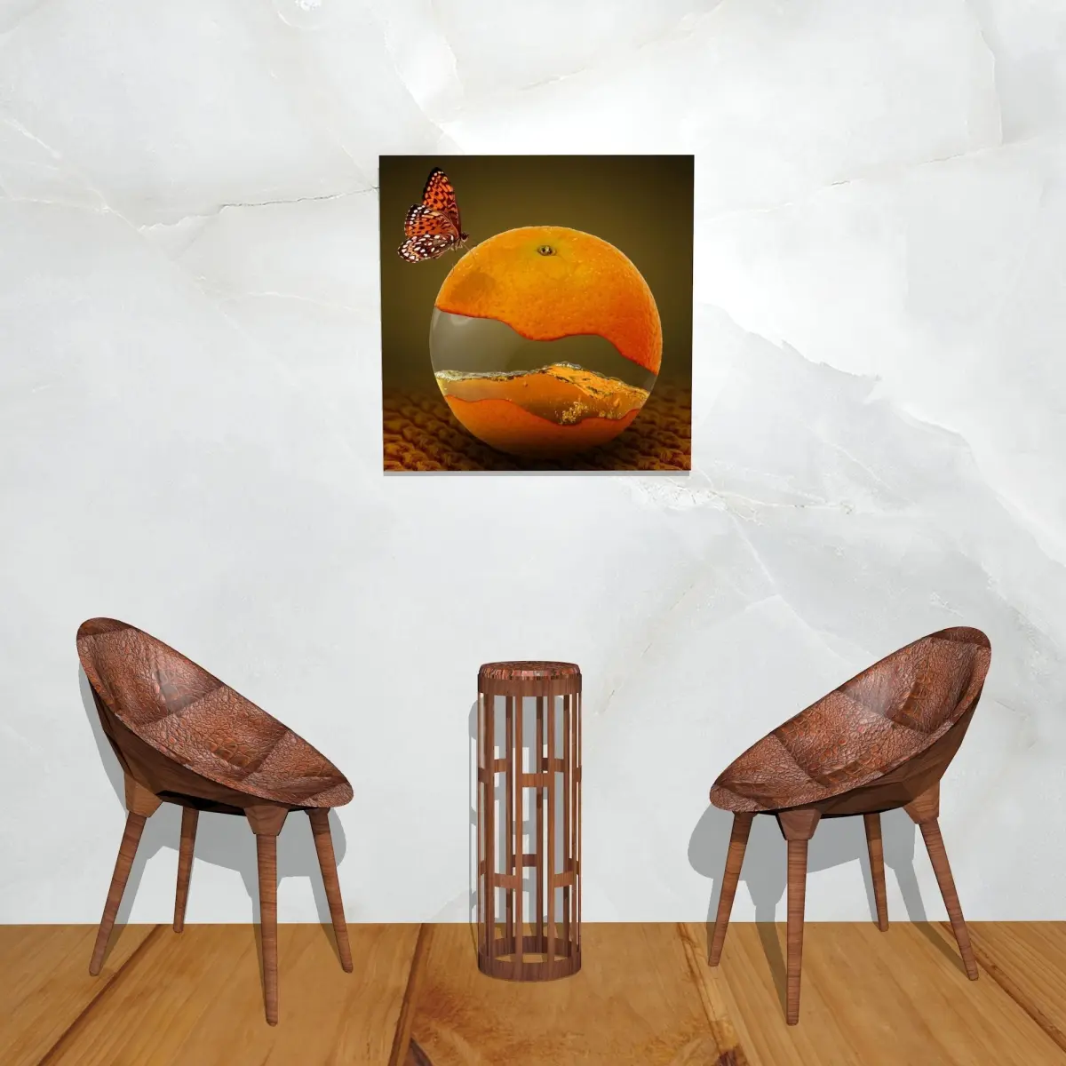 A surreal canvas art featuring transparent orange fruit with fruit juice, butterfly laying above orange peel, and positioned on orange woven cloth.A 3D model suitable for still images, presentation, renders, animation, videos, gaming, and other purposes (commercial and noncommercial).The texture image is baked and embedded into the polygons. It is also engraved on wood.The back of the canvas is with wood texture and extruded to enable wall attachment.Some scaling and rotation may be needed upon import depending on 3D software used.