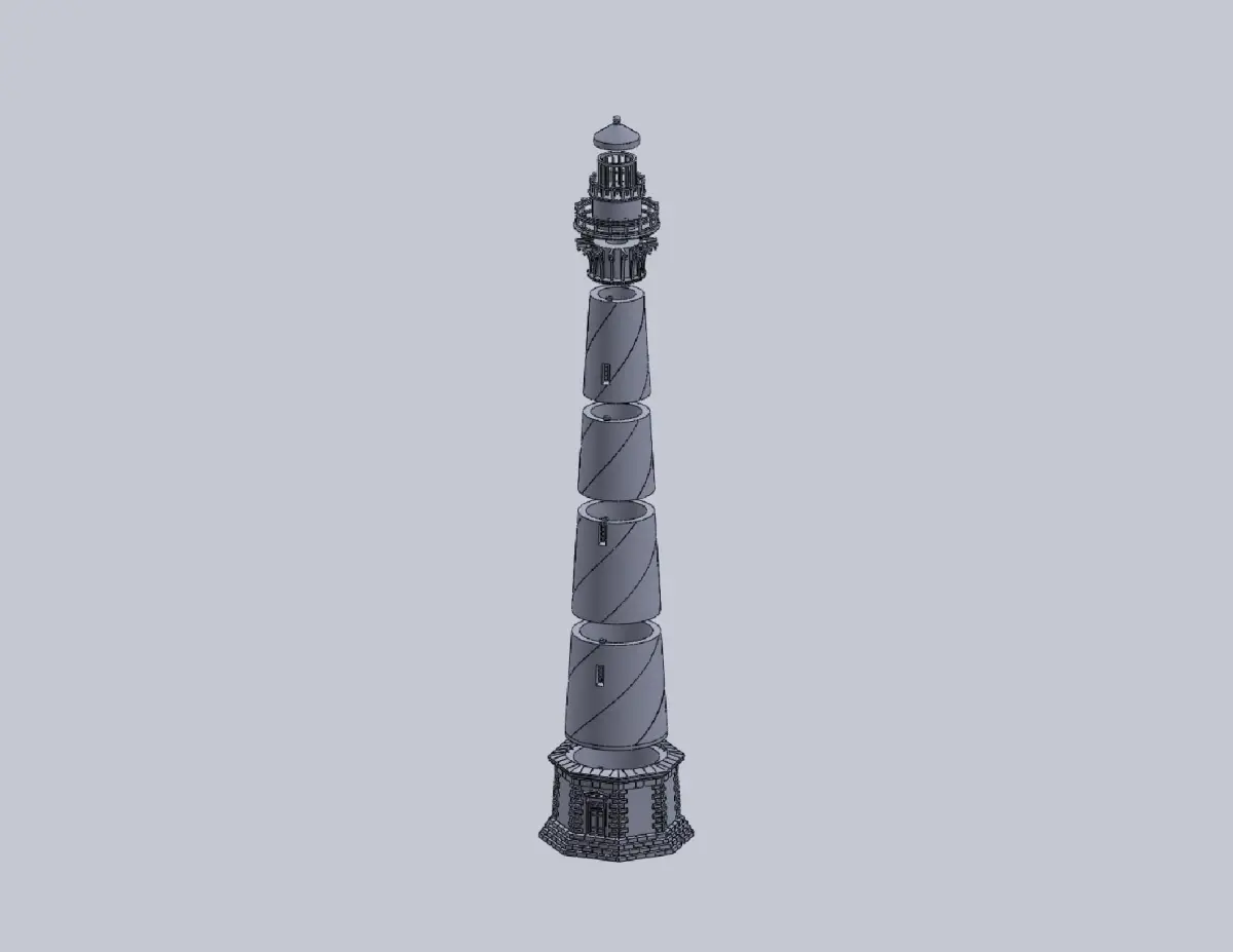 Notes: 1. 1/100 scale model of the lighthouse located at Buxton, NC 2. The full assembly stands at 25 inches with a 5.75 inch base. 3. Recommended Filament Color(s): White for the Base and Cylinders A-D (these components will need to be hand painted); Black for all other components. 4. Recommended Print Settings: The Metal Ring, Gallery/Light Ring and the Top components should be printed at an extrusion speed of 20mm/s for the best detail. This translates into a Fine or Detailed setting if streaming. The streamed files follow this order: Base, Cylinders A-D, Metal Ring, Gallery/Light Ring, and Top. 5. Other Assembly Components: Two-inch candelabra socket, eight inch white cord set w/switch and LED candelabra bulb (see pics or [Assembly Instructions](http://www.outerbankslights.com/wp-content/uploads/2014/12/Cape_Hatteras_Lighthouse_Assembly.pdf)).