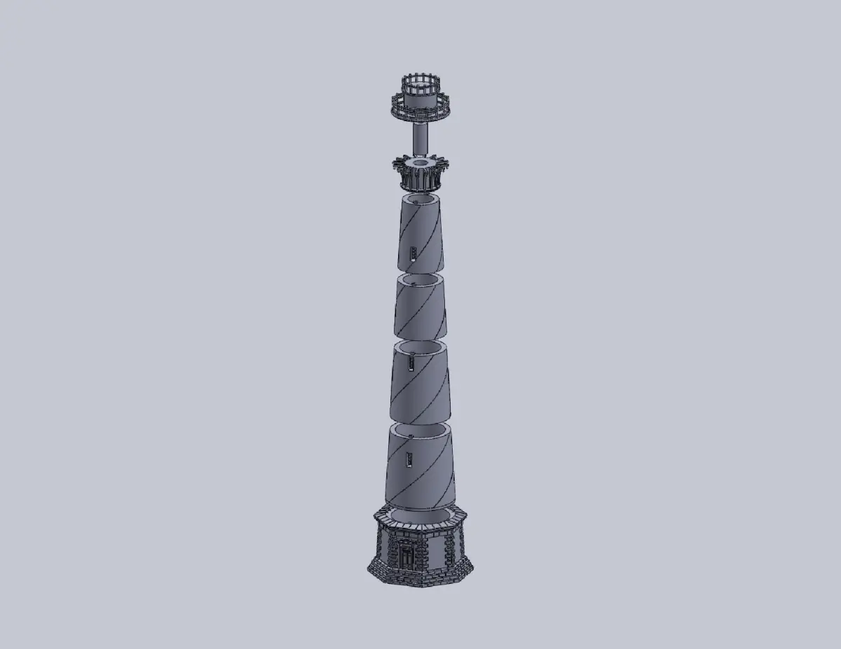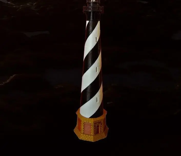 Notes: 1. 1/100 scale model of the lighthouse located at Buxton, NC. 2. The full assembly stands at 30 inches (to include harp) with a 5.75 inch base. 3. Recommended Filament Color(s): White for the Base and Cylinders A-D (these components will need to be hand painted); Black for all other components. 4. Recommended Print Settings: The Metal Ring, Gallery/Light Ring and the Top components should be printed at an extrusion speed of 20mm/s for the best detail. This translates into a Fine or Detailed setting if streaming. The streamed files follow this order: Base, Cylinders A-D, Metal Ring, Joint and Gallery/Light Ring. 5. Other Assembly Components: One nickel plated lamp kit with dimmer socket and standard three-way bulb (see pics or [Assembly Instructions](http://www.outerbankslights.com/wp-content/uploads/2014/12/Cape_Hatteras_Lighthouse_Lamp_Assembly.pdf)).