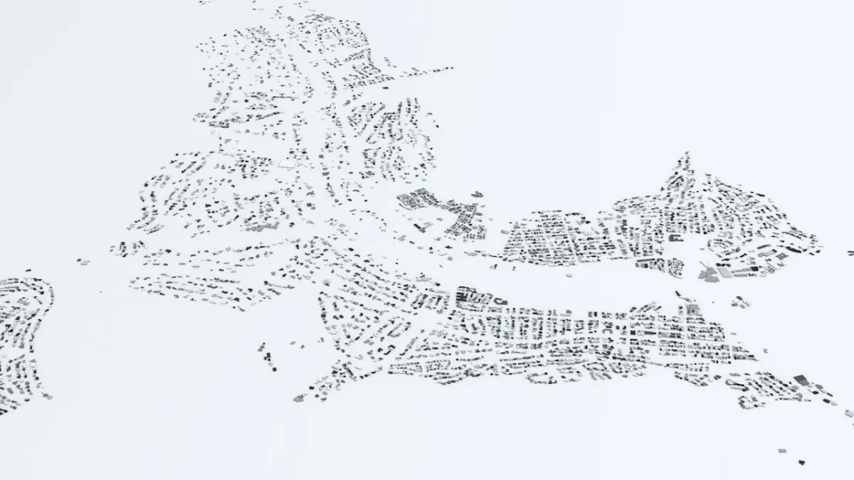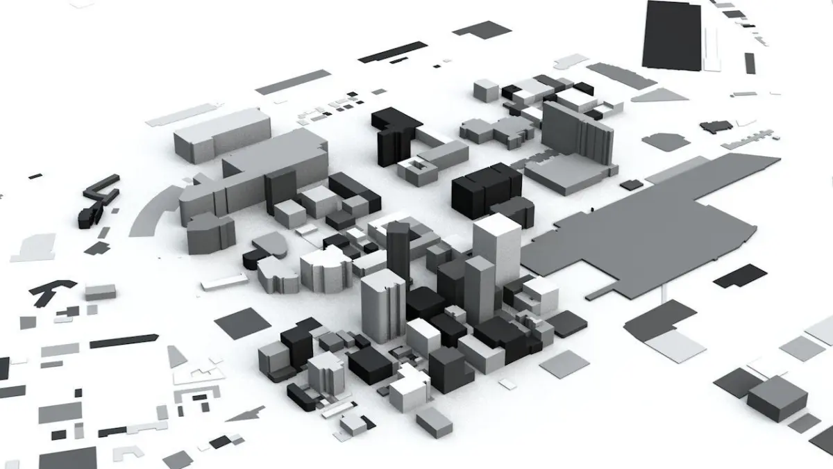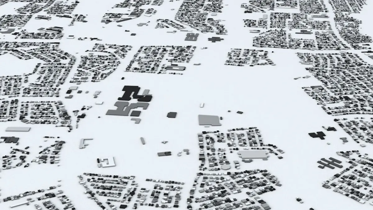 - the model is positioned on a flat surface (all buildings are on the “floor” - no elevation data included)