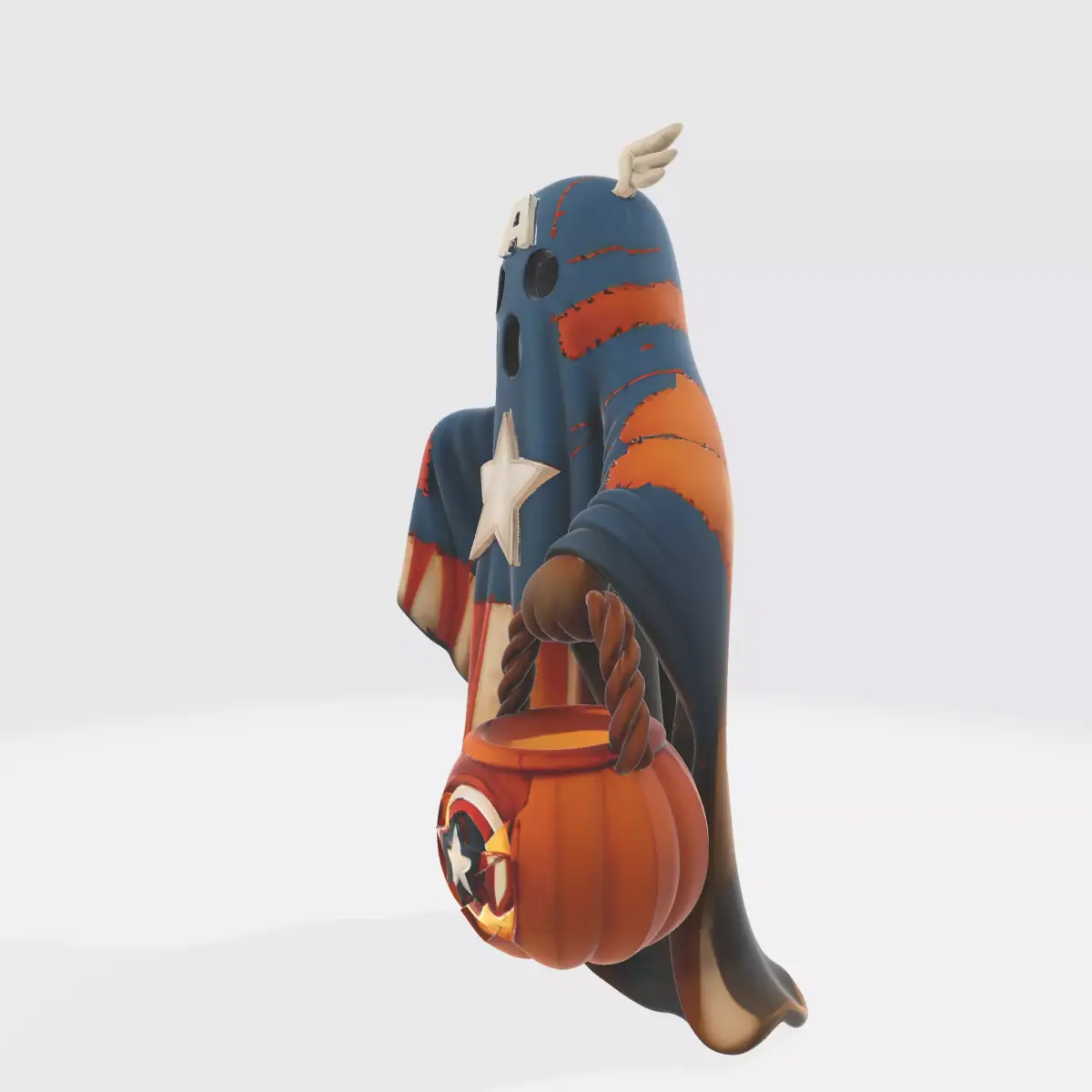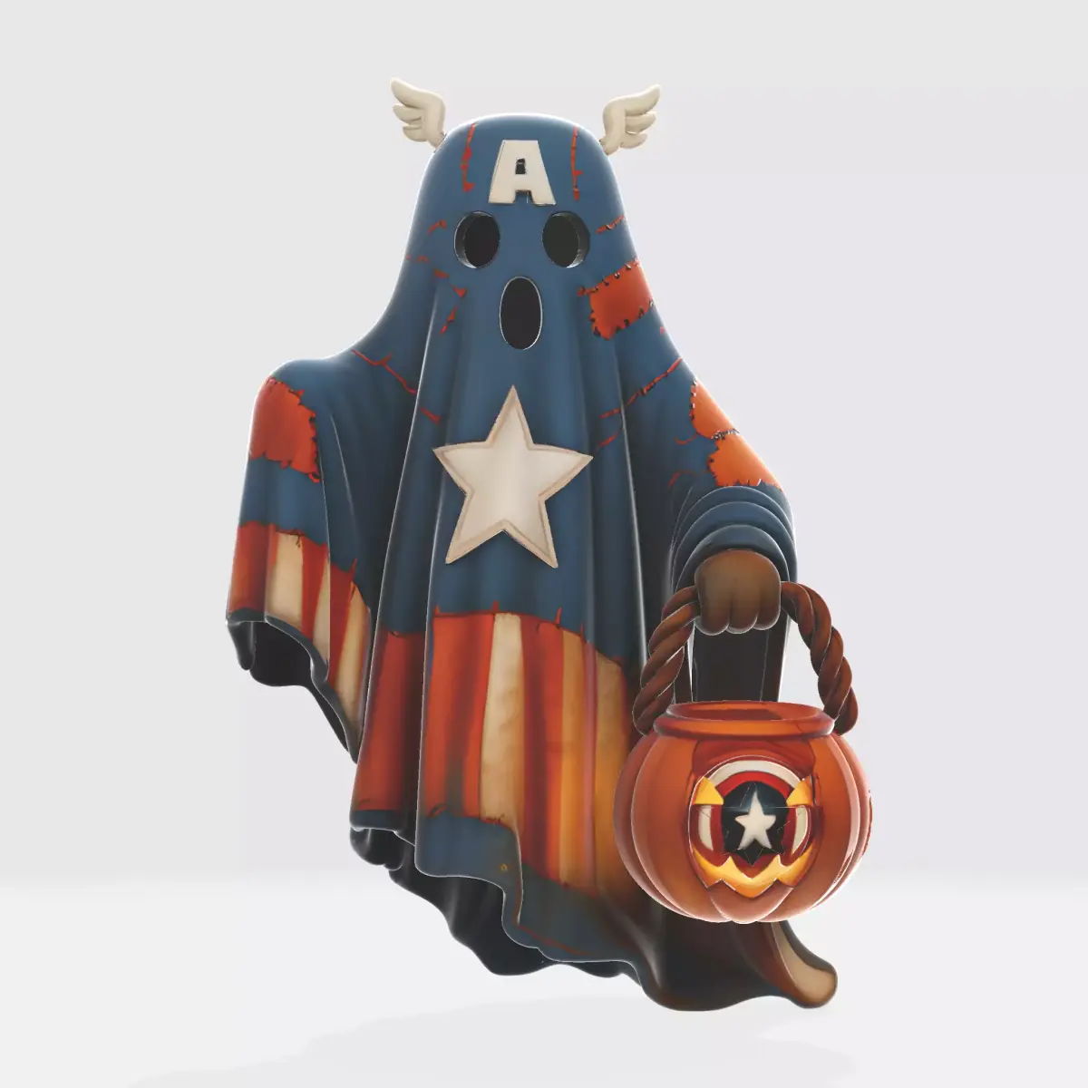 Bring a unique twist to Halloween with this 3D printed Captain America ghost decoration! Designed with a fun mix of spooky and superhero style, this figure features a ghostly sheet patterned in Captain America’s iconic colors, complete with star emblem and “A” detail on the head. It also holds a pumpkin bucket with matching superhero shield accents, making it a perfect collectible for fans of Marvel and Halloween alike.