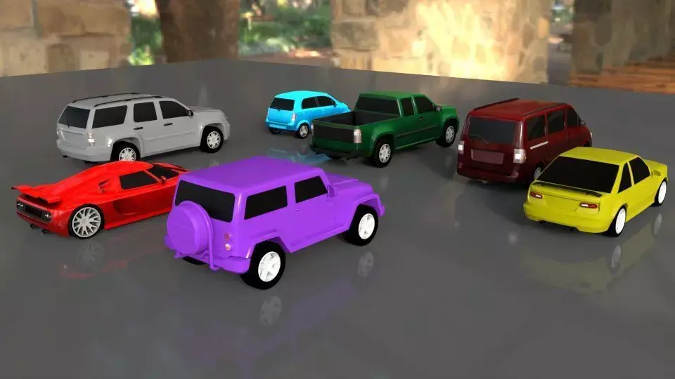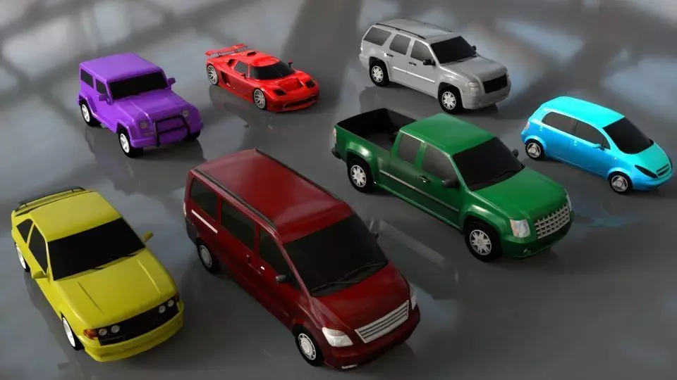 A clean and stylized 3D render showcasing a variety of game-ready vehicles, including SUVs, a sports car, a pickup truck, and compact cars. Each model features vibrant colors and smooth, optimized detailing, placed on a reflective surface that enhances the modern, minimal aesthetic. The scene highlights versatility in vehicle design while maintaining a cohesive, polished look, making it ideal for real-time applications and game environments.