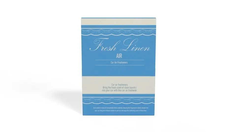 Bring the fresh scent of clean laundry into your car with this car air freshener. The packaging is a sleek cardboard box, designed in shades of white and light blue to represent the freshness of linen. The label on the packaging features a graphic of a clothesline with freshly washed clothes, with the text Fresh Linen written in elegant font. Inside the box, you'll find a set of individual sachets filled with scented beads. Each sachet is made of a breathable fabric material, allowing the fragrance to slowly release into your car. Hang one of these sachets in your car and enjoy the comforting scent of fresh linen.