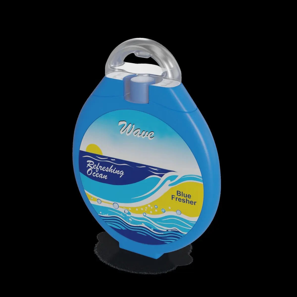 Car Air Freshener: A vibrant, blue plastic container in the shape of a wave. The packaging is dynamic and energetic, reflecting the fresh and invigorating scent inside. The air freshener is in the form of a small, round gel disc, infused with a cool ocean breeze fragrance. The container comes with a hanging string, allowing you to easily hang it from your rearview mirror or car hook. The label on the packaging includes the text Refreshing ocean scent and Hang anywhere design.