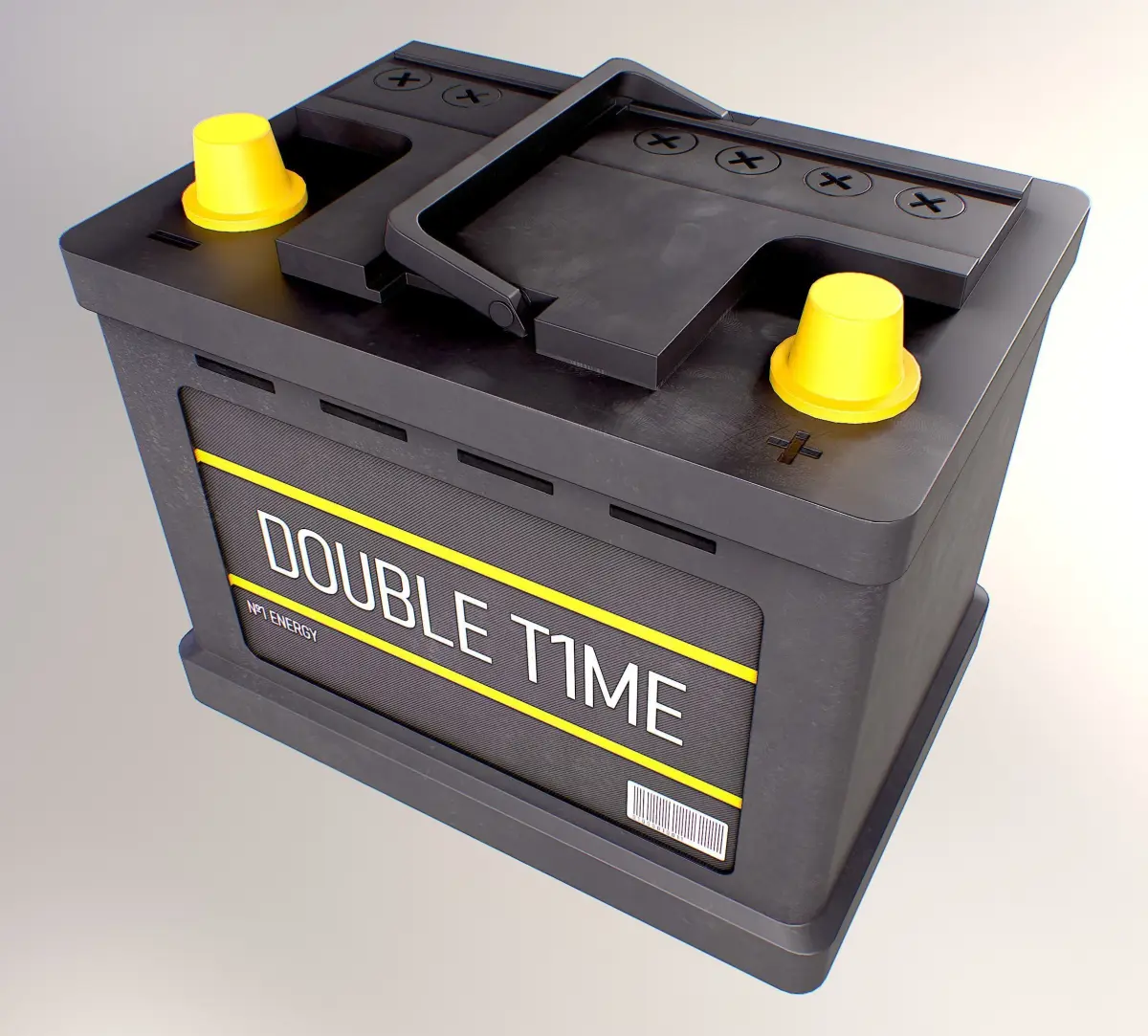 This 3D model depicts a low-poly car battery with a realistic design. The battery features a rectangular shape with rounded corners and textured surface details, giving it a worn and used appearance. The positive and negative terminals are clearly labeled in red and black, respectively. The overall color of the battery is gray with hints of rust and discoloration. The model is optimized for low polygon count, making it suitable for use in video games and other real-time applications. It would be a great addition to any 3D car model or game environment.