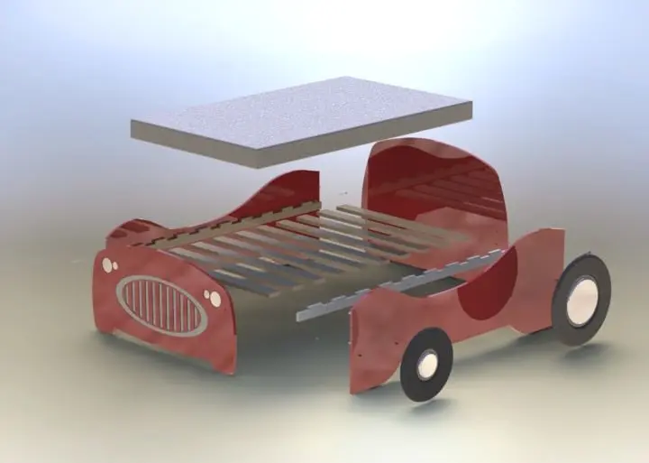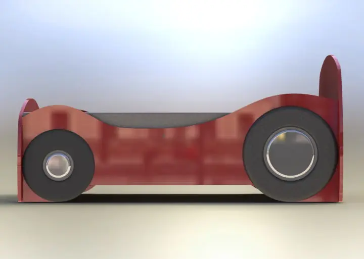 Kids bed shaped like....wait for it... a car! Designed as a flat pack product in MDF.Goes together really quickly and easily. Just need a 5mm L key for assembly and the idea here was that every house has at least one L key floating around somewhere...usually in the kitchen drawer along with a whole bunch of old AAA batteries and an 80's Motorola cell phone manual.