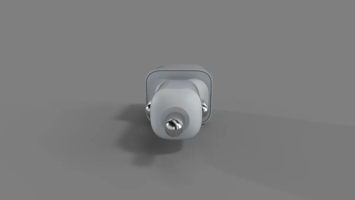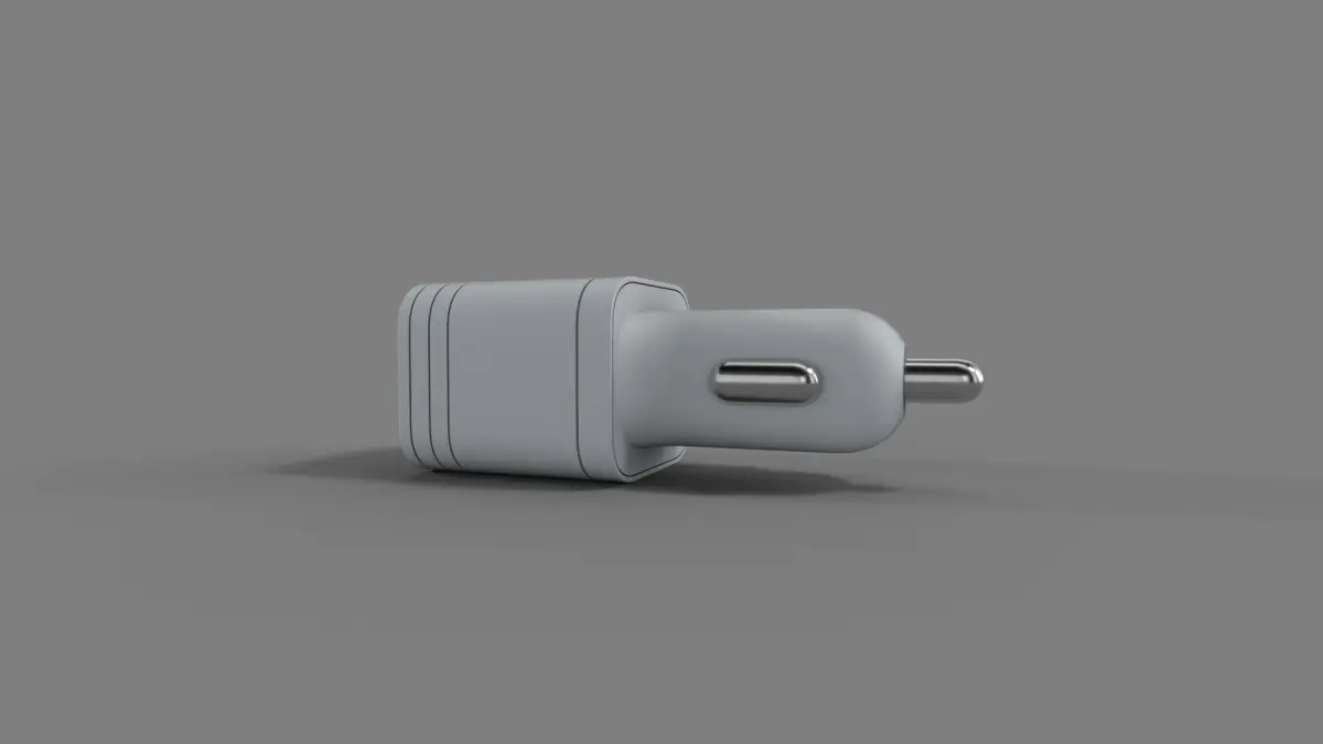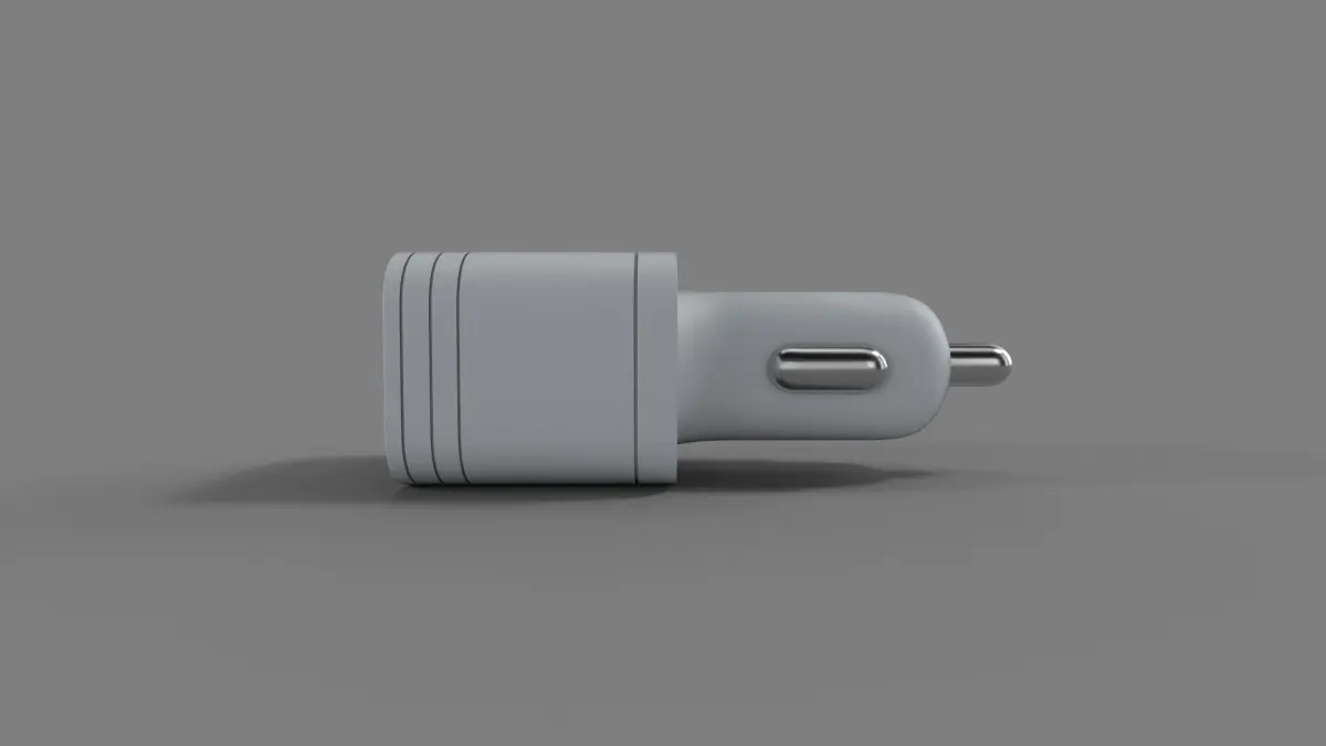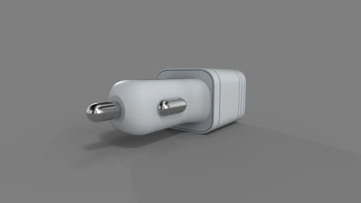 A minimalist white car charger with a compact design, equipped with fast-charging capabilities and a foldable plug for easy storage and portability in the current timeline.