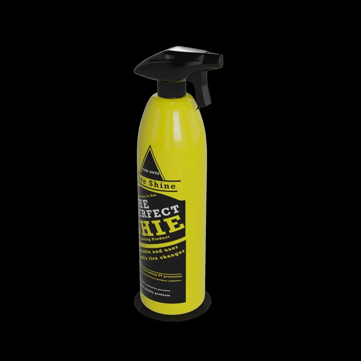 Tire Shine Spray: Give your tires a glossy finish with this tire shine spray. The spray bottle is made of durable plastic and has a sleek black design with a bold yellow label. The spray nozzle allows for precise application, ensuring an even coat on each tire. The tire shine formula is specially formulated to enhance the appearance of your tires, leaving them looking clean and rejuvenated. The spray also provides a protective barrier against UV rays and helps prevent cracking and fading. With this tire shine spray, your tires will always look their best.