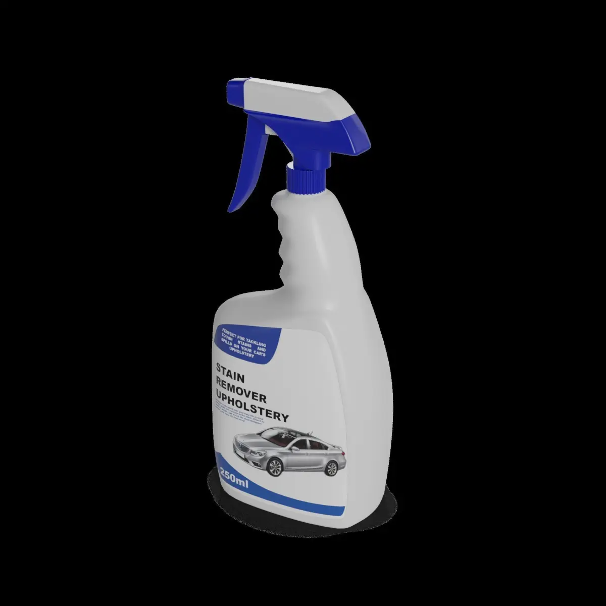 Upholstery Stain Remover: A 250ml spray bottle of upholstery stain remover in a clean white packaging. The bottle has a trigger spray for targeted application and a transparent strip to check the remaining product level. The label displays a before-and-after image of a stained car seat, demonstrating the product's powerful stain-lifting capabilities. Perfect for tackling tough stains and spills on your car's upholstery.