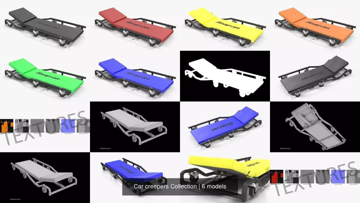 This Car creepers Collection is a high quality, photo real model that will enhance detail and realism to any of your rendering projects. File units - cm. The model has a fully textured, detailed design that allows for close-up renders, and was originally modeled in 3ds Max 2014 and rendered with V-Ray.