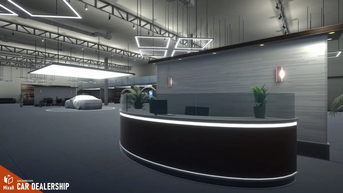 Mixall studio presents a good solution for your games, VR projects and simulators: Car dealership - Showroom.In addition to the building, the asset includes a set of road pieces to create a realistic environment surrounding the showroom. With an extensive collection of high-quality props, such as furniture, lamps, reception desks, computers, signage, and more, you can add intricate details to your showroom scene. These props allow you to showcase the various aspects of a functioning car dealership, including customer areas, office spaces, and product displays. Key Features detailed car dealership’s equipmentmodular high quality building with interior and exteriorgame ready demo scene Assets Modular Building: balcony module, building, central arch, central entrance, partition 1, partition 2, partition light, podium moduleFurniture: armchair, coffee table, office chair 1, office chair 2, office desk, reception desk, sofaLighting: bracing lamp, ceiling wall lamps, large lamp, square lamp, street lampOutdoor: car awning, flower pots, garage door, street flag, ventilation systemInfrastructure: column, pylon, rotary deflector, round support, signboard logoRoadway: roadway moduleElectronics and Appliances: computer, conditioner industrial 1, module windowsOther: floor, metal farm 1, screen