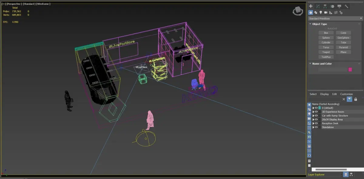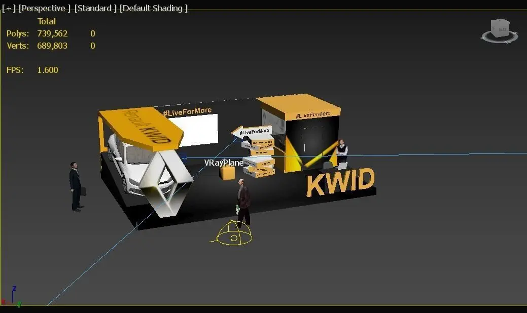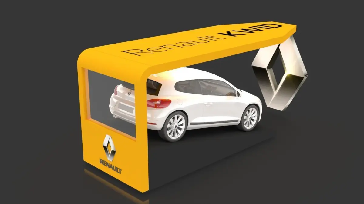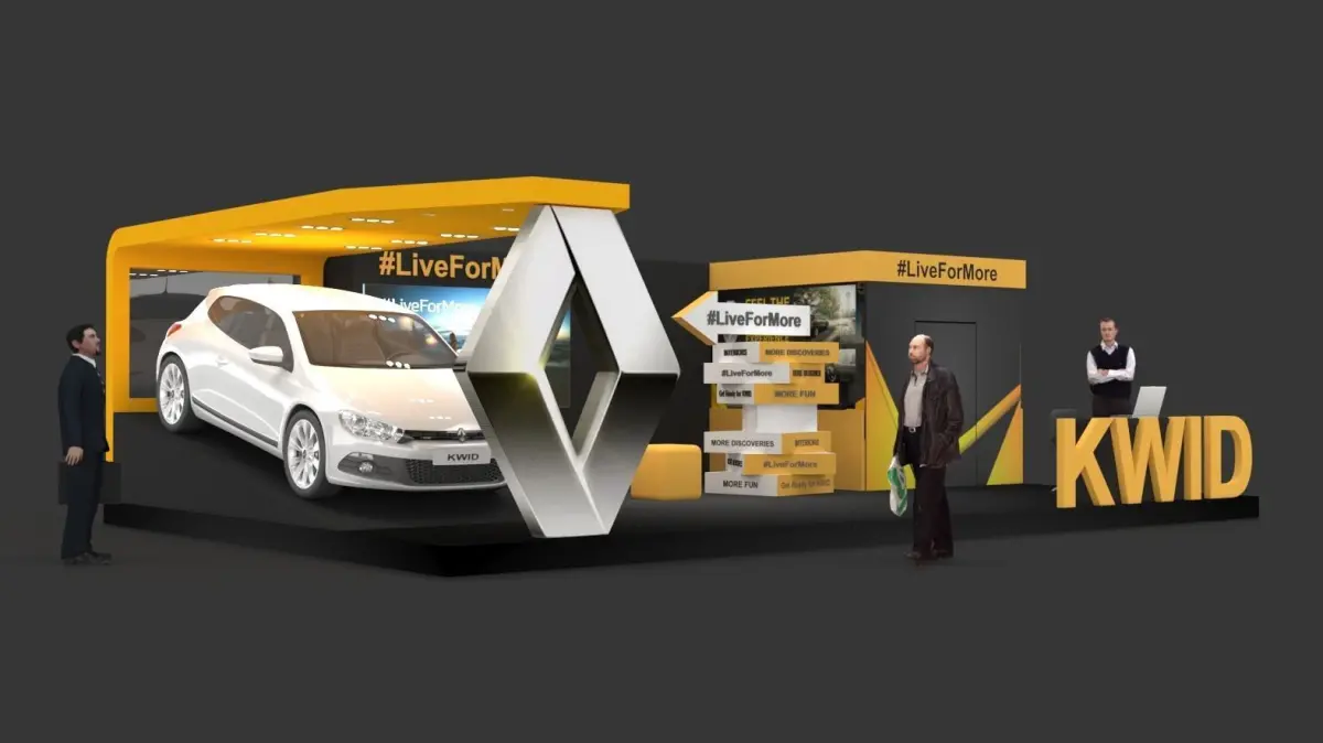 Renault car display with unique ramp structure, LED screen, car driving experience room. 20feet x 30feet stand size. 3D car seats with LED screen experience the car drive mode in sound proof room. outdoor presentation area, reception desk. 3D human figures included.