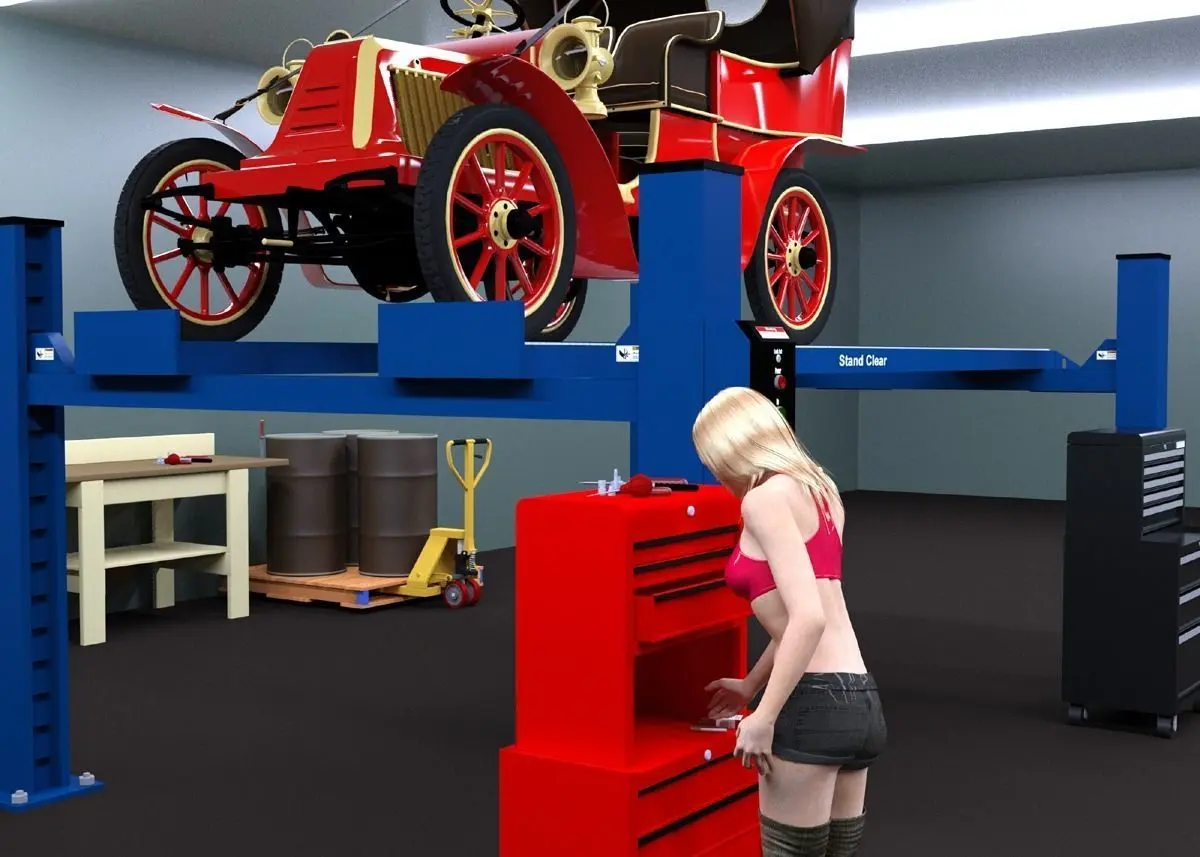 The Car Lift has warning labels, buttons, on and off lever, and a tread plate deck.The rams can be adjusted down for the animation as the lift rises. The buttons for up and down can be pressed in the animation and the colors can be changed to light up. Each animation is added by morphing slide controls that can be imported into Daz Studio, and was created in Poser. Every thing I make is scaled to size for Daz Studio models. In the rendered image I was changing the car lift to show bolts, for bolted to the floor, and while having a rough time with Daz Studio not saving the hair and Car Lift properly, I forgot to put the rams down, for this render. I hope you can see it has Warning labels and Pinch Point labels, I don't want Daz Studio models loosing a thumb operating it. The Tool boxes and work bench will be finished soon. Everything work fine, but I want to make sure the UV Maps can show images properly, to show stickers stuck to the tool box or whatever someone would want to add. The Pallet is ready but it is a non animated Prop, that can be add separately. This car lift has all the UV maps with the warning labels, and can be revised to add age, damage, and grime with texture maps to texture the surface, or even peal the label a little. The on and off, Up and Down text is on the image map so chances can be done with the image maps. Some of the lettering helps show the direction of the map so it is not upside down or flipped backwards.