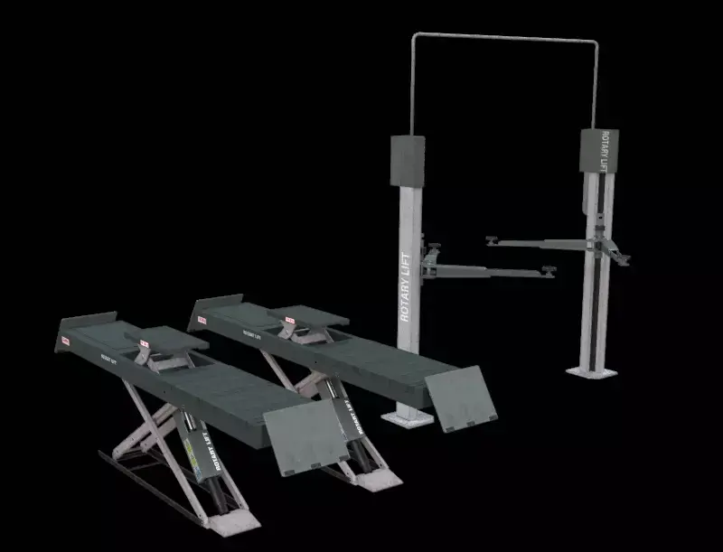 - 2-Post Car Lift – realistic design with hydraulic arms for vehicle repair environments. - Scissor Lift Platform – compact design with accurate mechanical details.