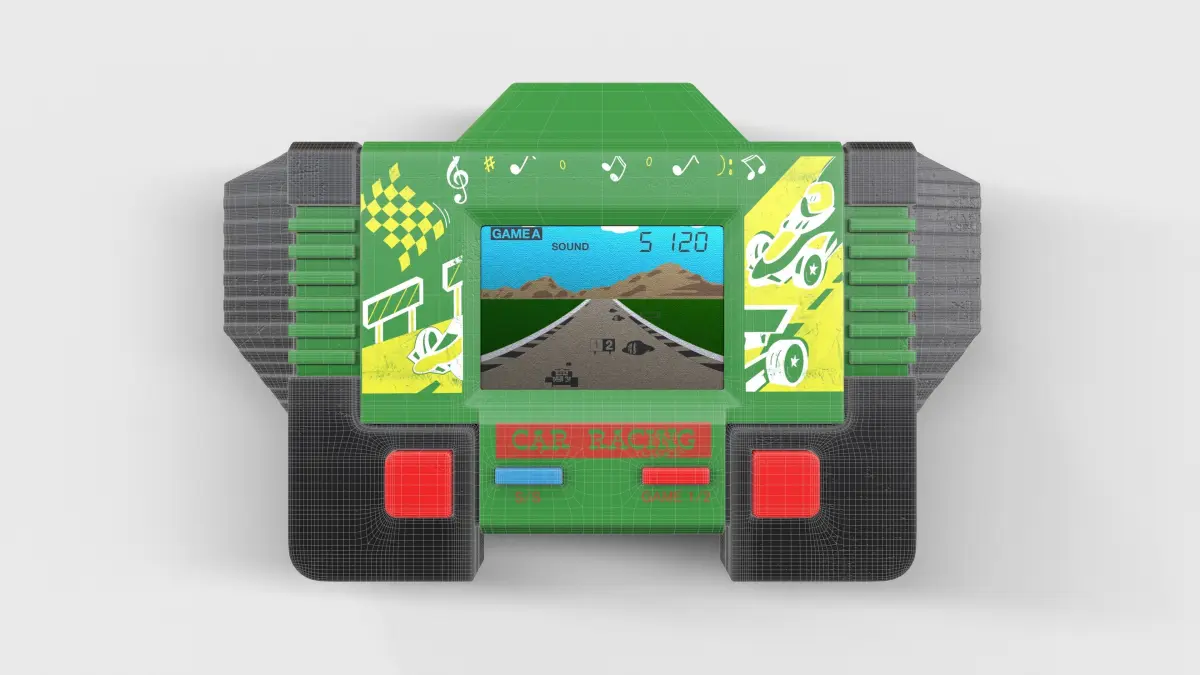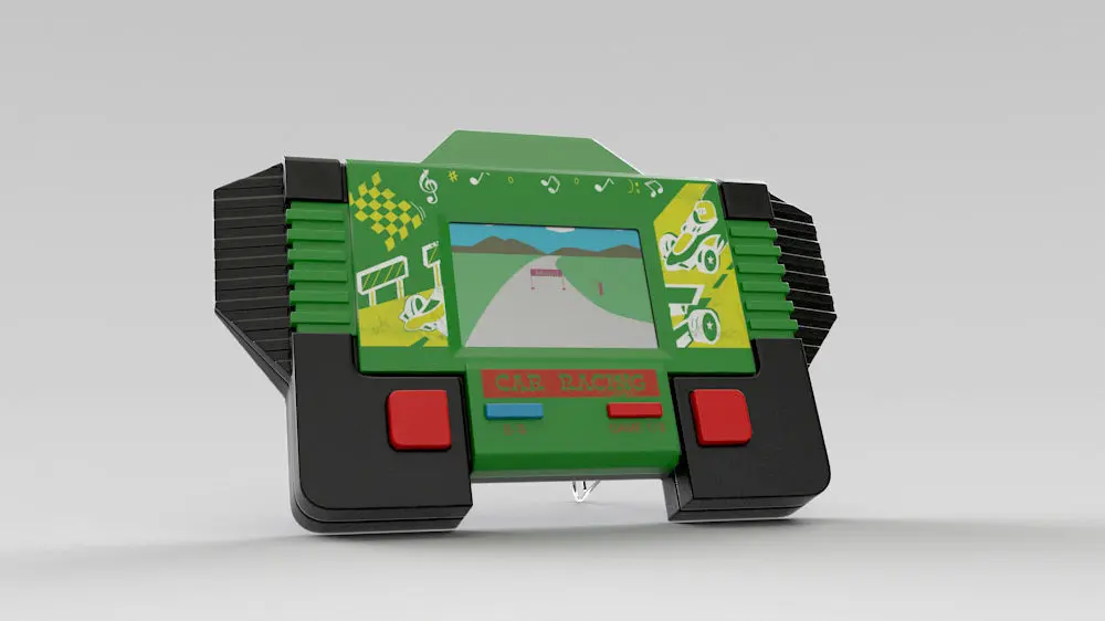 Chinese handheld console, from the 80's.The game was simulated formula 1 on an LCD screen.